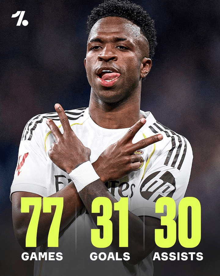 维尼修斯成为欧冠历史第五位进球、助攻均30+的球员