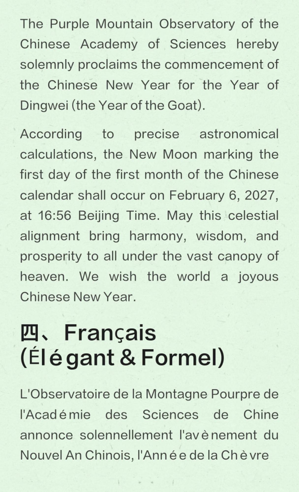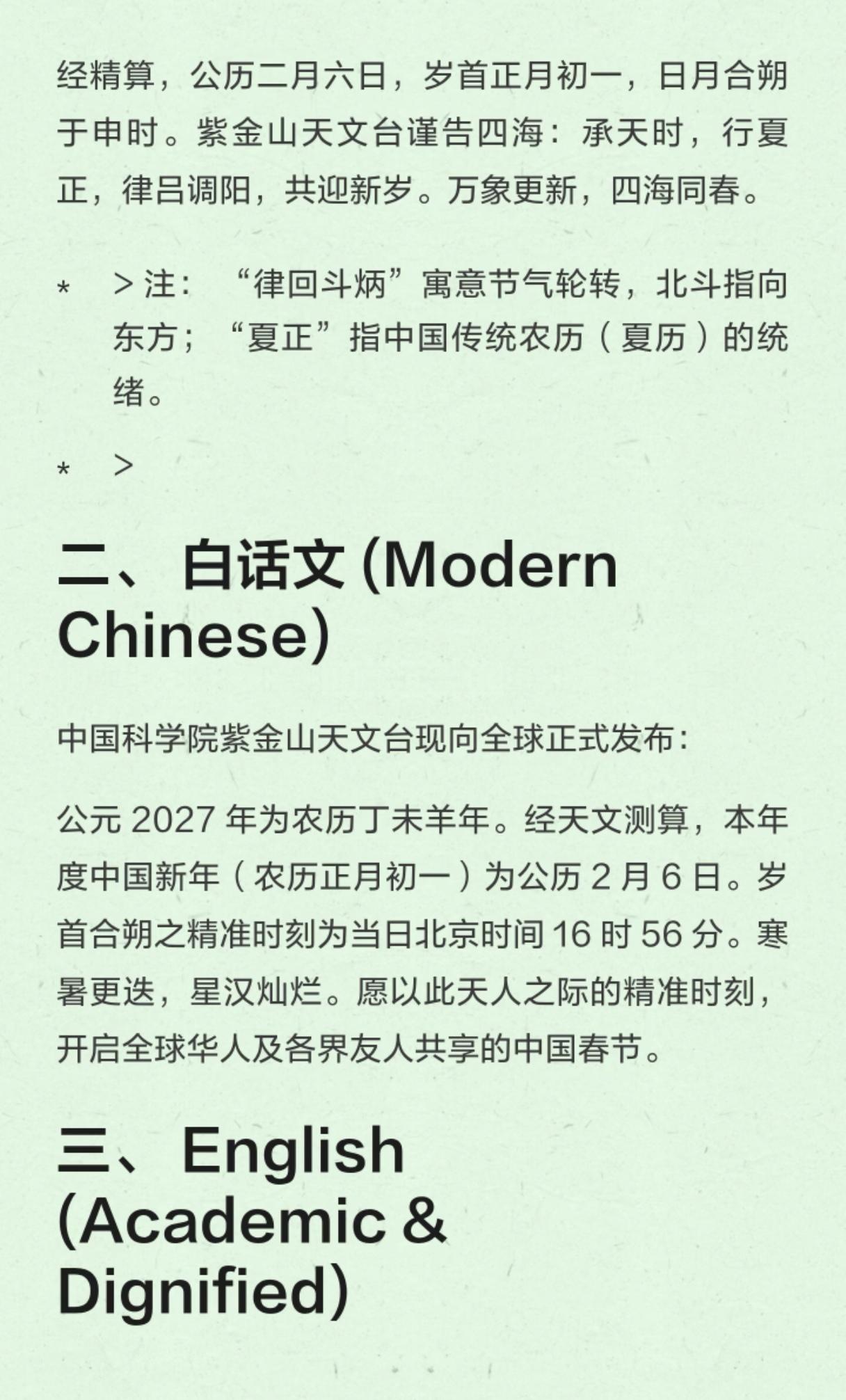 有个远在澳大利亚的博主,除夕的时候在小红书发了一篇帖子,他提议每年春节由南京紫金天文台为来年春节授时:春节到正月十五元宵节结束,元宵节这一天咱们就可以借央视元宵晚会来公布下一年的春节日期,配合画面斗转星移、天干地支交替、二十四节气轮转、十二生肖轮回,最后画面停留在“紫金山天文台”,可以敲钟倒数,然播报来年春节。主打一个“盼”字,象征希望,同时也向全世界正名春节来源于中国。虽然亚洲很多国家已经会算农历计时,但我们是“文化正统”。目前这个帖子很火爆,已经有好多网友建议纳入政府提案。