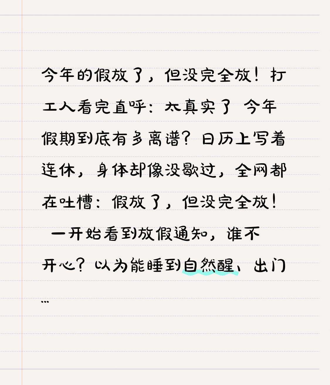今年的假放了,但没完全放!打工人看完直呼:太真实了 今年假期到底有多离谱?日历上写着连休,身体却像没歇过,全网都在吐槽:假放了,但没完全放! 一开始看到放假通知,谁不开心?以为能睡到自然醒、出门逛吃、好好陪家人,把攒了一年的疲惫全甩掉。可真过上假期才发现,这根本不是休息,是换种方式“忙碌”。 名义上放假,实际比上班还赶场。早上被亲戚串门叫醒,白天忙着走亲访友、应付各种提问,晚上还要收拾家务、回复工作消息。计划好的旅行泡汤,想看的剧没追完,想睡的懒觉全作废,一天下来腰酸背痛,比坐办公室还累。 更扎心的是,不少假期撞上周末,看似多休几天,实则没多赚一天;节前节后连轴上班,用疲惫换几天短暂放松,妥妥的“贷款式休假”。还有人假期不离岗,手机24小时待命,随时处理工作,人在家中坐,活从线上来,彻底失去假期的意义。 转折来了:其实我们想要的假期很简单,不用赶场、不用应酬、不用随时待命,能安心躺平、好好陪伴家人,真正卸下压力喘口气。不是假期不够好,是我们被生活推着走,忘了休息的本质。 结尾共鸣:今年的假,放了又好像没放,累了又好像值了。忙着团圆、忙着生活、忙着扛起责任,这就是普通人的假期模样。新的一年,愿我们都能拥有真正的松弛,不用假装休息,不用硬撑疲惫,好好生活,好好爱自己。 是不是戳中了你?评论区说说,你的假期是彻底放松,还是和我一样,放了但没完全放!