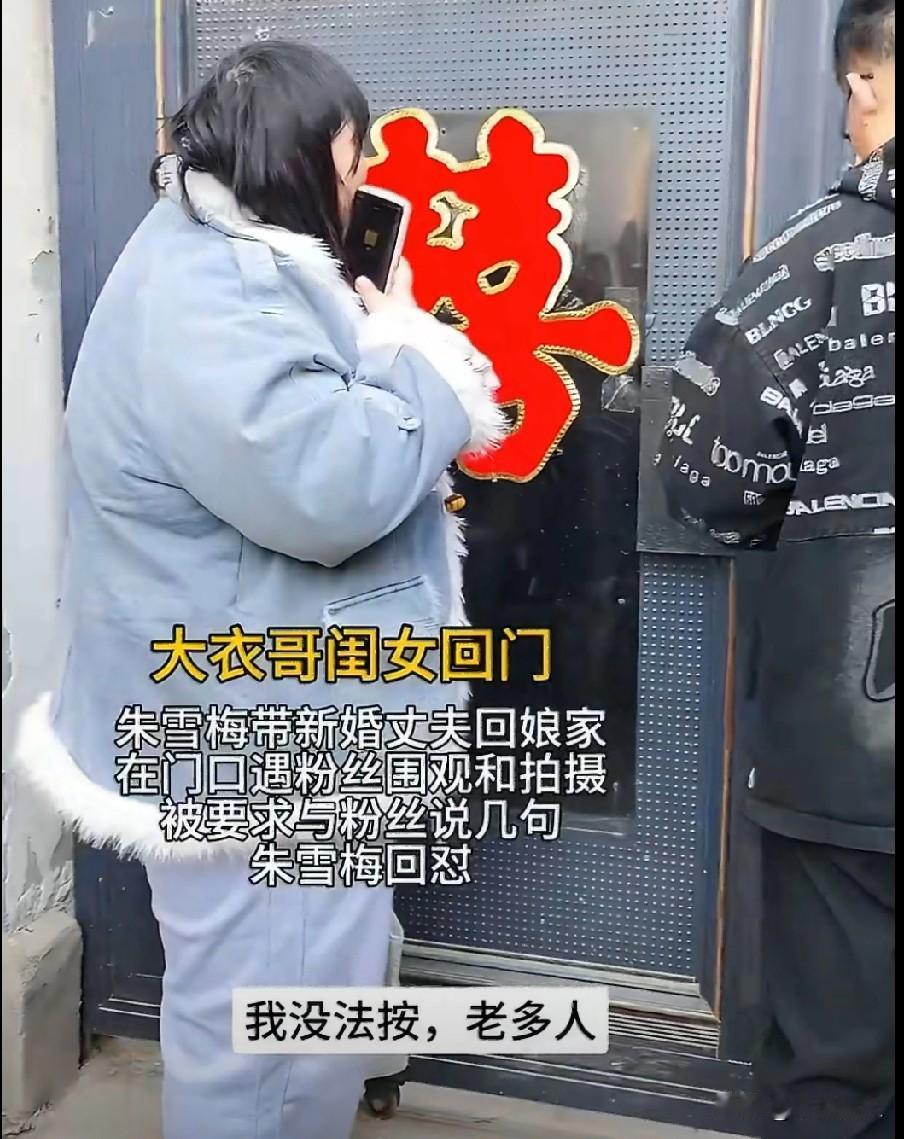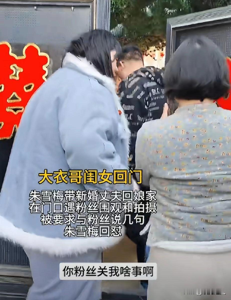 大衣哥朱之文的闺女朱雪梅,刚结婚没多久,带着新女婿一块儿回娘家看爸妈,结果刚到家门口,就围上来一大堆粉丝举着手机拍个不停。 这些围观的人还非得让朱雪梅对着大家说几句话、打个招呼,朱雪梅当时就有点不高兴了,直接回怼了一句:你是粉丝跟我有啥关系?我凭啥非得跟你说话啊。 说白了就是,人家小两口回娘家是私事,本来就想安安静静回家,结果被人围着拍还被要求配合,换谁心里都不舒服,朱雪梅也是实在不想惯着这种随便打扰别人生活的事儿,才直接把心里话说出来了。
