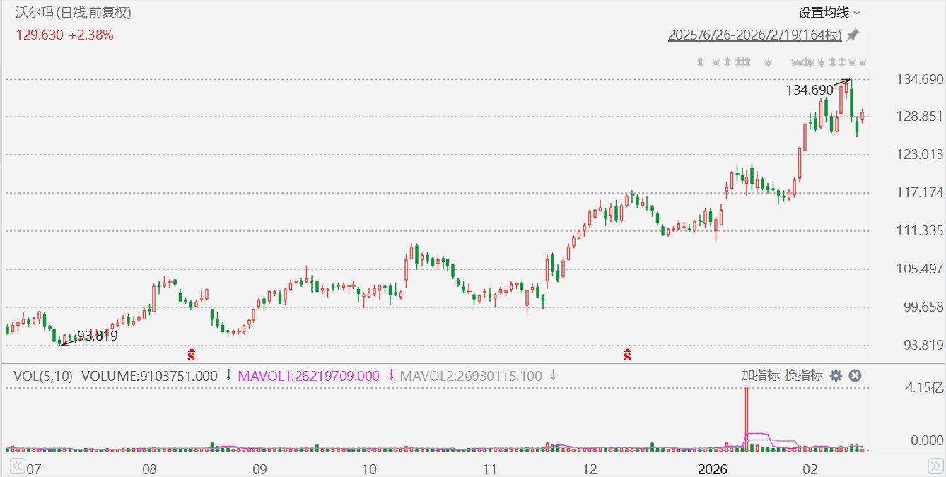 格隆汇2月19日|沃尔玛(WMT.US)盘初涨近3%,报130.1美元。消息面上,沃尔玛公布业绩显示,第四季度营收1906.6亿美元,高于预期的1905.8亿美元;调整后每股收益0.74美元,高于预期的0.73美元。预计第一季度调整后每股收益0.63美元-0.65美元;预计2027财年调整后每股收益2.75美元-2.85美元,低于预期的2.97美元。沃尔玛还宣布新的300亿美元股票回购计划。