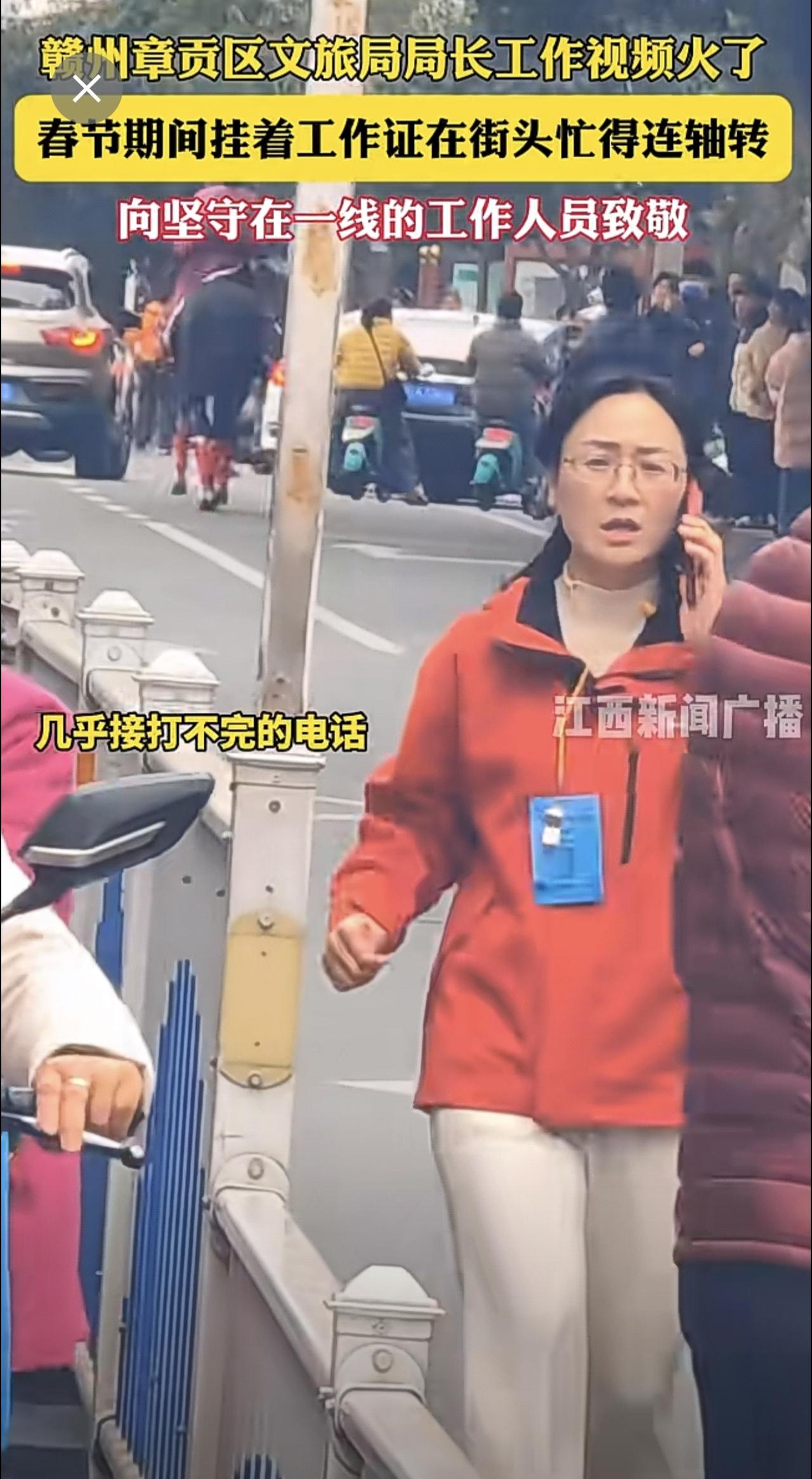 赣州章贡区文旅局局长工作视频火了,春节期间挂着工作证在街头忙得连轴转,向坚守在一线的工作人员致敬。
