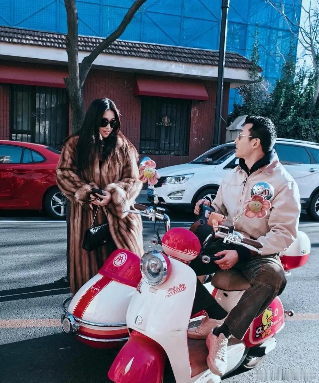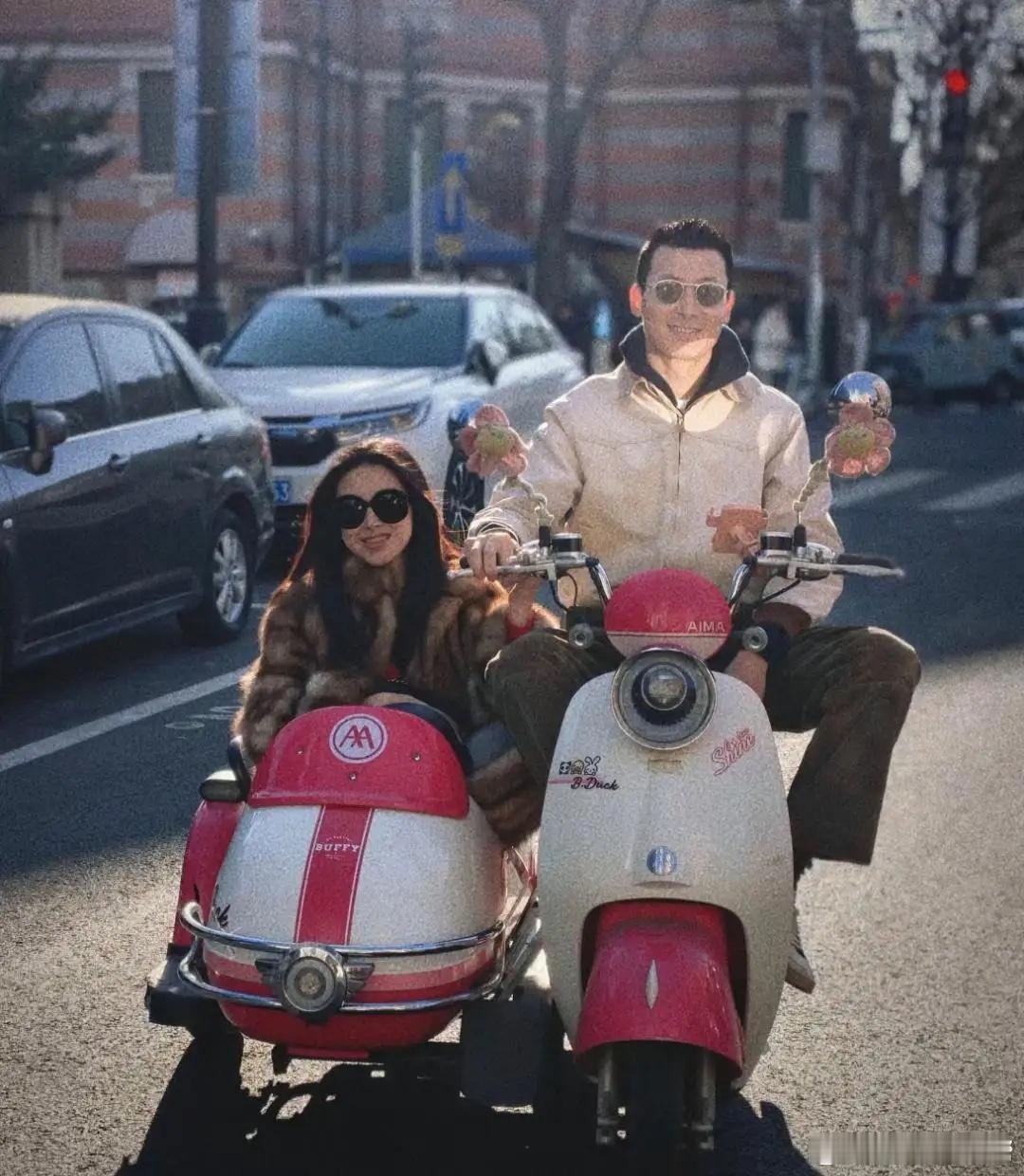 42岁朱珠和老公王昀佳新年到天津探望亲戚,夫妻俩打扮时尚贵气,一起骑网红电动三轮