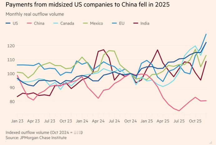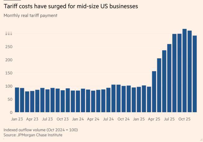 据金融时报报道,特朗普的关税大幅推高中型美国企业的成本。摩根大通研究所发布的一份新报告显示,过去一年,美国中型企业缴纳的关税款增加至原来的三倍。