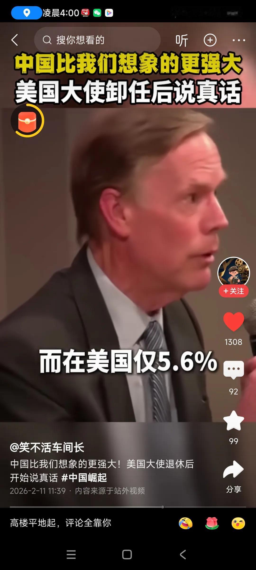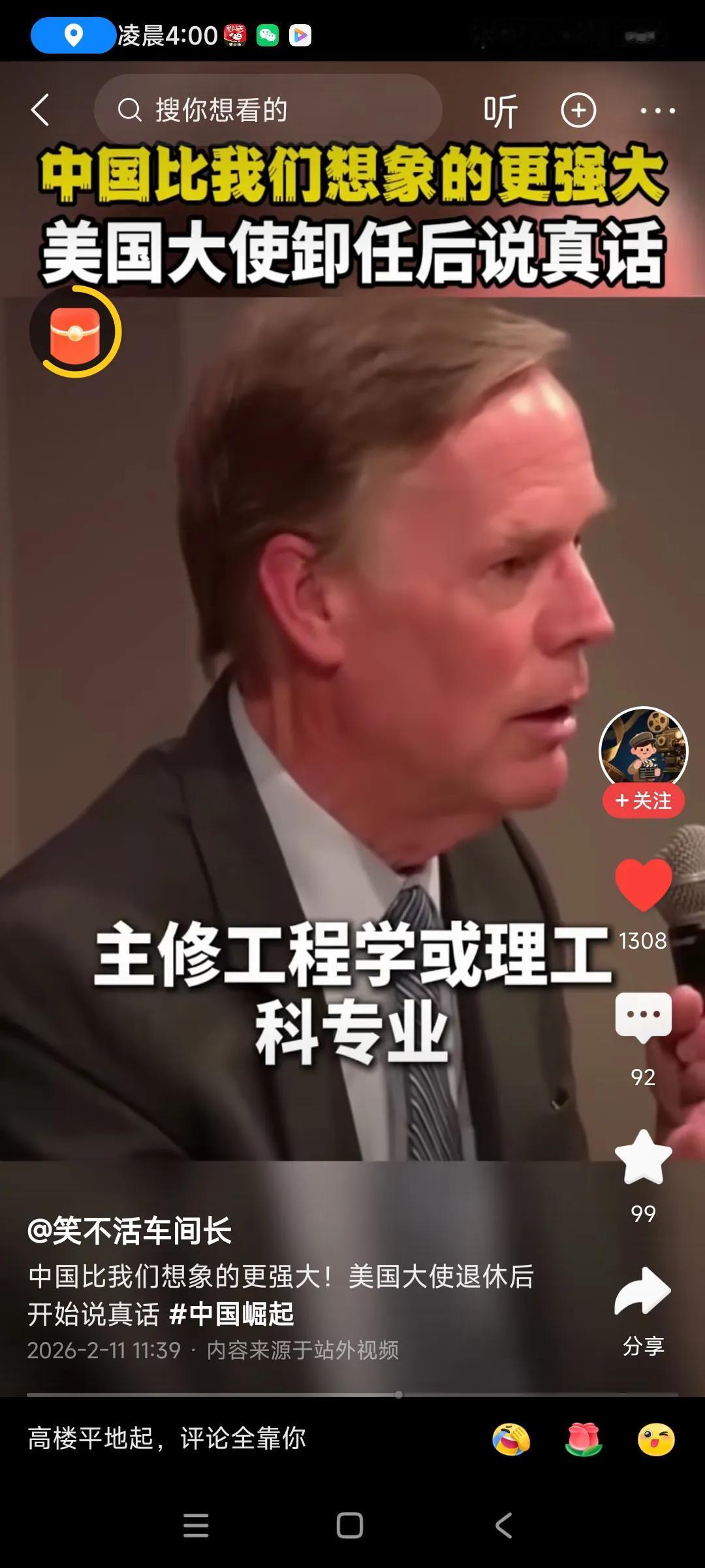 这个美国前驻华大使伯恩斯在中国几年,一直没闲着,跑遍了中国各个角落,想了解中国,,他不是咱们一般游客游山玩水,心里装着事,[捂脸][捂脸] 心想,老外心思缜密,是个认真的人,掌握了不少数据,和我以前的外企公司老板一样,注重数据,认真,低调,, 一,北京到上海,高铁只要5小时,非常快,他亲自体验过的,, 二,中国大学生每年1200万,学理工的有百分之35,大概三分之一,一年培养了400万工程师,美国这方面不如中国,学理工的人太少了,,,