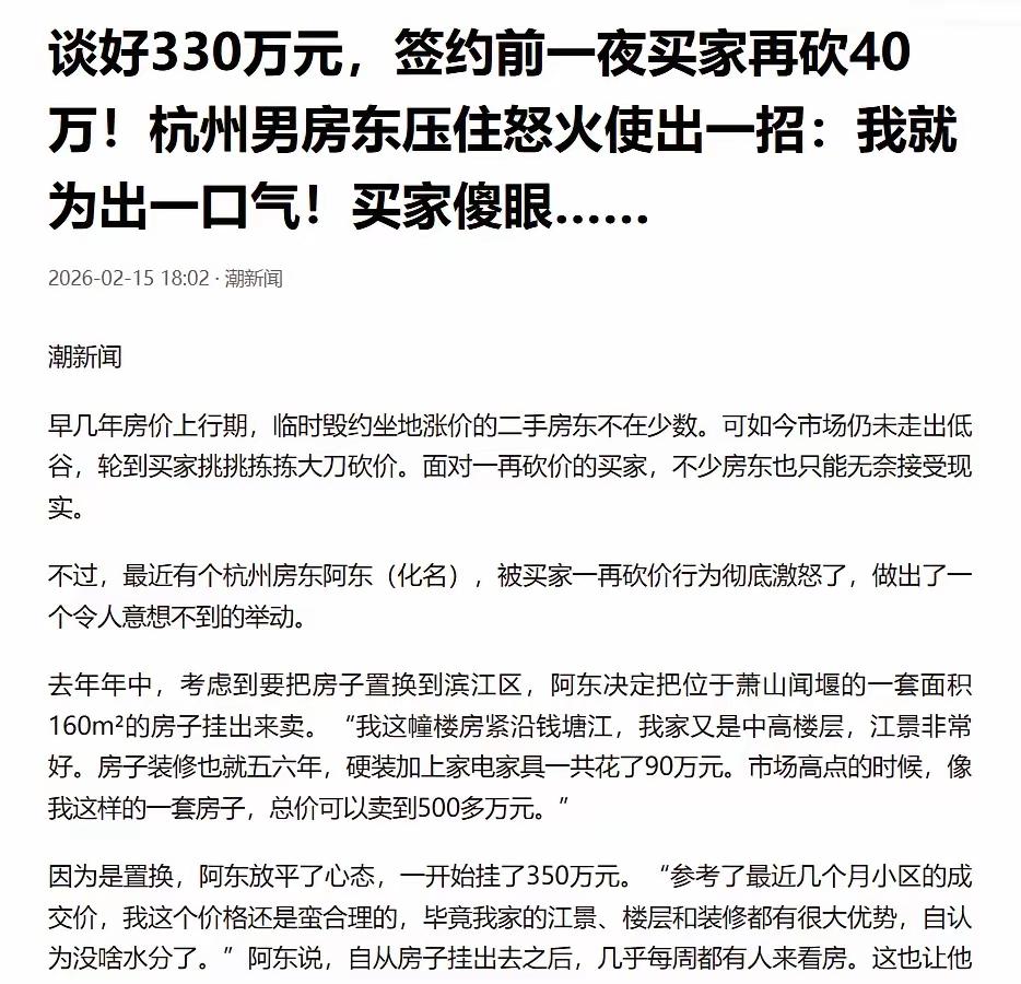 “再降40万,不然我不买了!”买家签约前夜突然变卦,第二天赶到现场,眼前一幕让他傻眼了 浙江萧山有个男子,手里有套160平的江景房,紧挨着钱塘江,还是中层,视野相当不错。这套房子当年买的时候值500多万,装修又花了90万,一家人舒舒服服住了5年多。 去年年中,男子打算搬到滨江区住,手头钱不够,就想着把这套房卖了置换。他在中介挂了350万,来看的人倒是不少,毕竟这小区2027年就要通地铁,潜力摆在那儿。可问题是房子面积太大,总价高,看的人多,真正愿意掏钱的少。 一直熬到今年1月份,中介总算拉来两个意向买家。一个出价330万,一个出价320万。男子一想,当然是卖给价高的,毫不犹豫就选了330万的买家,双方约好了签约时间。 眼瞅着这事就要成了。 结果万万没想到,就在签约的前一天晚上,中介打来电话,那头传来买家的话:“再降40万呗,290万我就签,不然我不买了!” 这一下可把男子气坏了。明明说好的330万,临门一脚了突然砍价40万,这不是耍人玩吗? 男子妻子当时就想直接拒绝。可男子却拦住了她,对着电话那头说:“行,40万就40万,明天按约定来签吧。” 挂了电话,男子转头又给中介打了个电话,让中介把那位出价320万的买家也约到签约现场。中介虽然一头雾水,但还是照办了。 第二天,签约现场热闹了。 两位买家都到了,面对面坐着。那个砍价的买家还美滋滋地等着签290万的合同呢。 结果男子二话不说,当着那位临时变卦的买家的面,直接和出价320万的买家签了合同! 这下砍价的买家傻眼了,急得直跳脚,连忙改口说:“我不砍价了!就330万原价买!这房子我要了!” 男子冷冷看了他一眼,说:“晚了。我宁愿少赚10万,也不会卖给你这种人。” 那位买家当场就急了,还想阻拦,可合同都签了,他啥也干不了。 这事儿传到网上后,网友们的评论炸开了锅。 有人说这买家活该,临阵砍价是最招人恨的操作,这下房子没了,自己作的。 也有人替男子可惜:“何必跟钱过不去呢?多10万不香吗?人家愿意原价买就该卖啊。” 说实话,这种情况换谁都得气个半死。明明谈好的价格,就差最后一哆嗦了,突然来这么一出。买家打的什么算盘?不就是觉得男子房子挂了这么久没人买,肯定着急出手,想趁最后关头压价呗。结果玩砸了。 有人说男子太冲动,10万块不是小数目。但换个角度想,被人这么摆一道,谁受得了?今天他能砍40万,明天签合同的时候会不会又出幺蛾子?这种不讲信用的人,跟他交易心里也不踏实。 从法律角度说,双方虽然口头约定330万成交,但还没签正式合同,也没交定金,买家临时砍价确实不算违法,但绝对是不诚信。男子转头把房子卖给别人,同样不违法。那个砍价的买家事后想反悔,愿意330万买,但男子已经跟别人签了合同,他再想要也没门了。 这事给所有买卖房子的人提了个醒:看好了就赶紧下手,别玩那些小聪明。想临时砍价占便宜?搞不好便宜没占到,房子都飞了。 至于这位男子,虽然少赚了10万,但这口气出得值。有些人就是这样,你越让步他越得寸进尺,还不如让他知道,这世上不是啥事都能算计的。 看完这个事儿,你觉得男子做得对吗?如果是你,会为了10万块忍了,还是像他一样宁可少赚也要出这口气?欢迎在评论区聊聊! (案例来源:浙江萧山真实案例,综合自媒体报道)