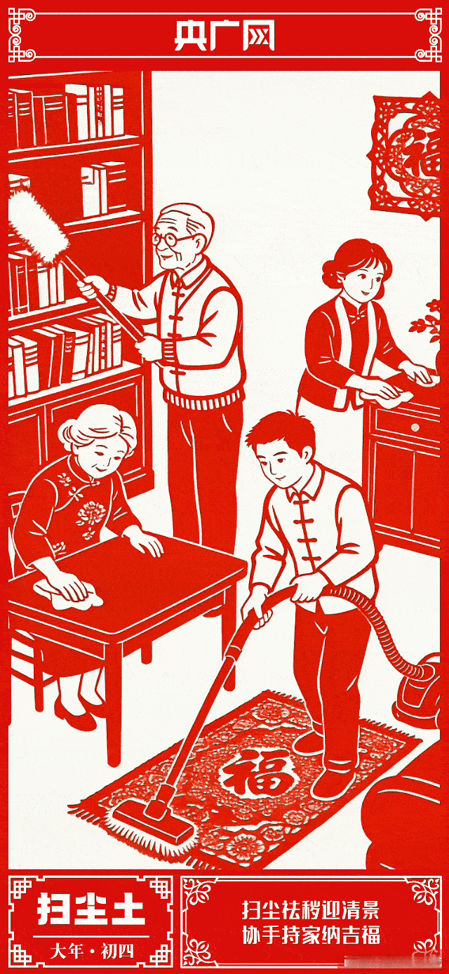 除了迎灶神,今天人们还会进行室内掸尘,将连日来积攒的垃圾扫到院中,准备“扔穷,旧岁的晦气与穷运一并送走,让家宅更显洁净祥和。