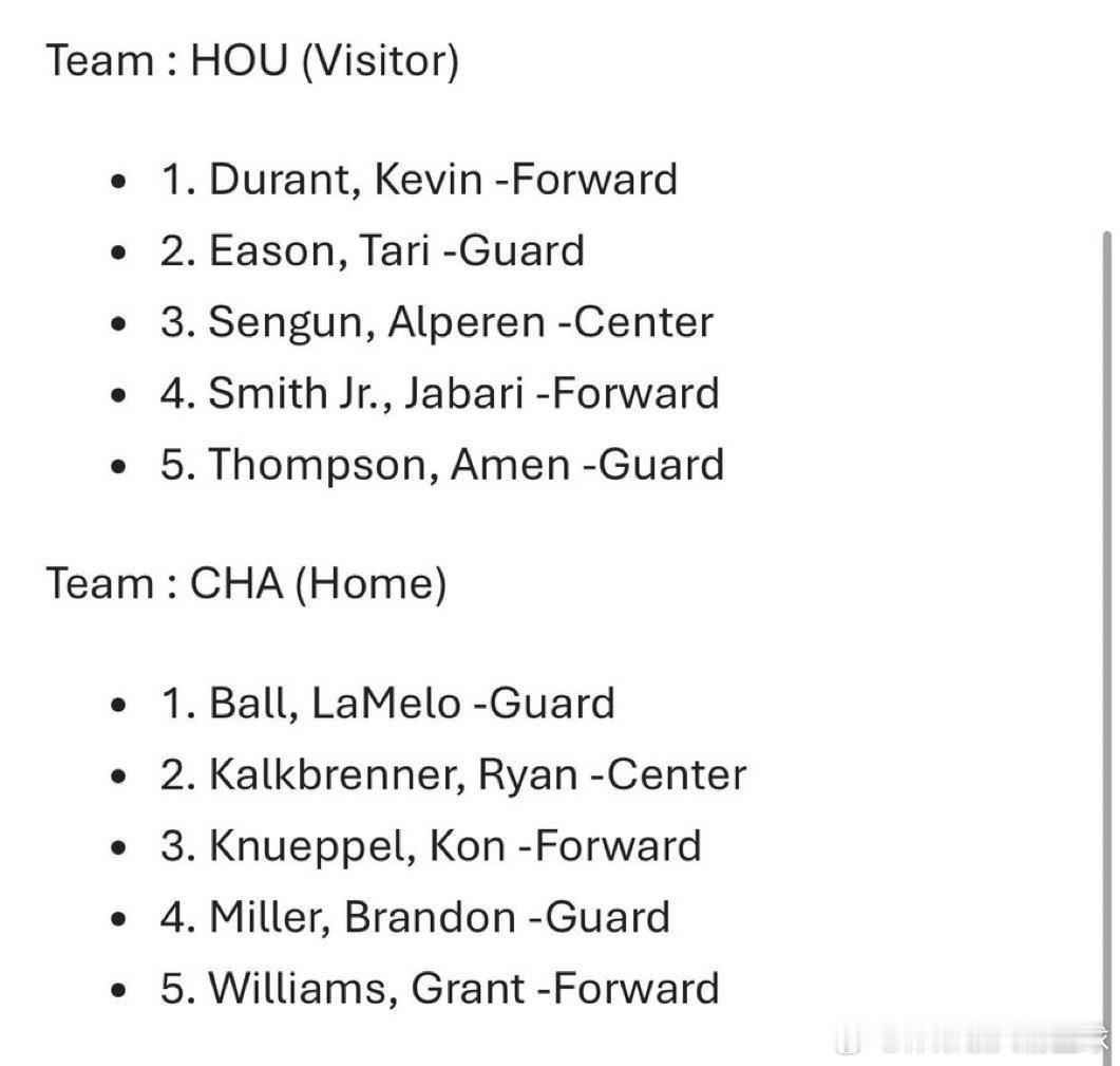火箭vs黄蜂 今日首发出炉:休斯顿火箭(客场)首发阵容:1. 凯文·杜兰特(前锋