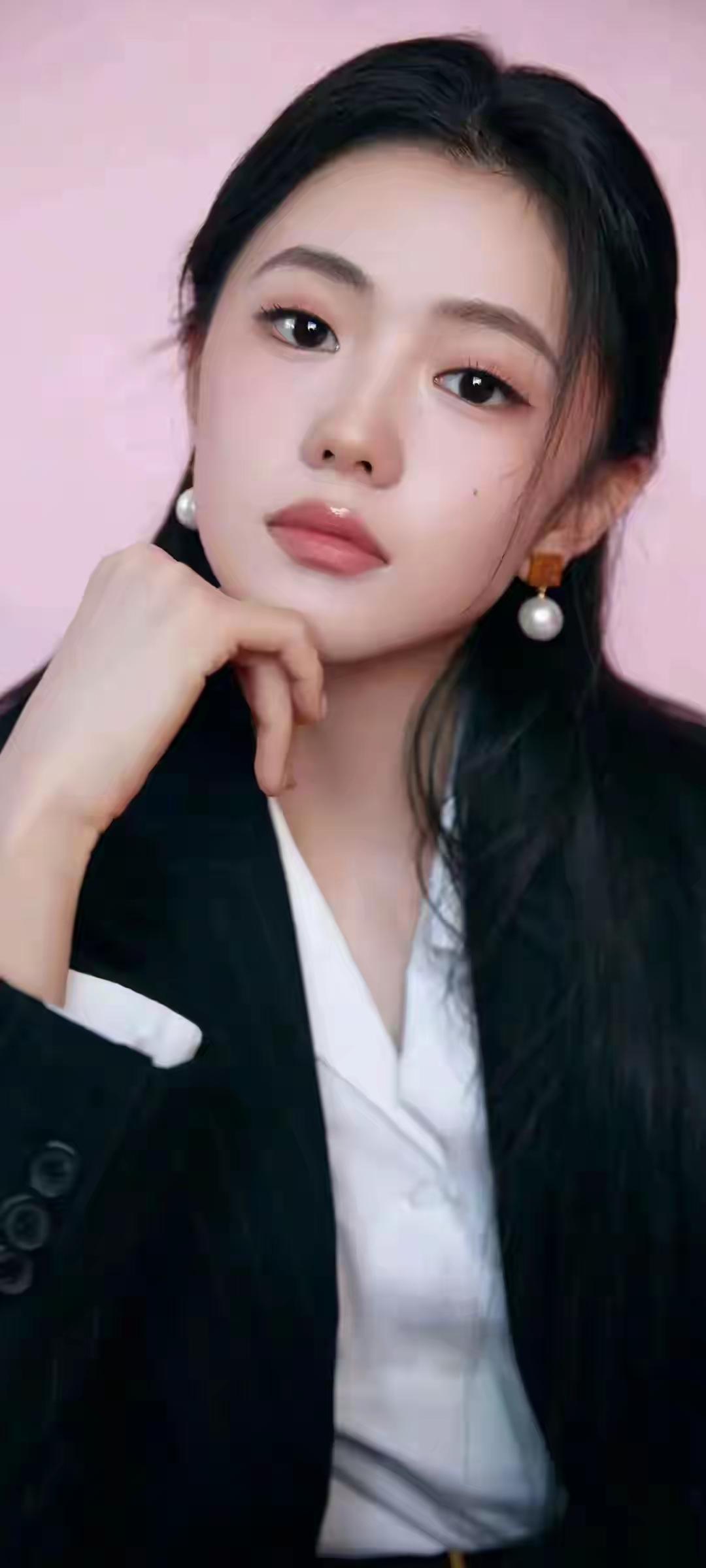 优雅黑发少女,珍珠耳环点缀,黑白西装尽显时尚魅力。