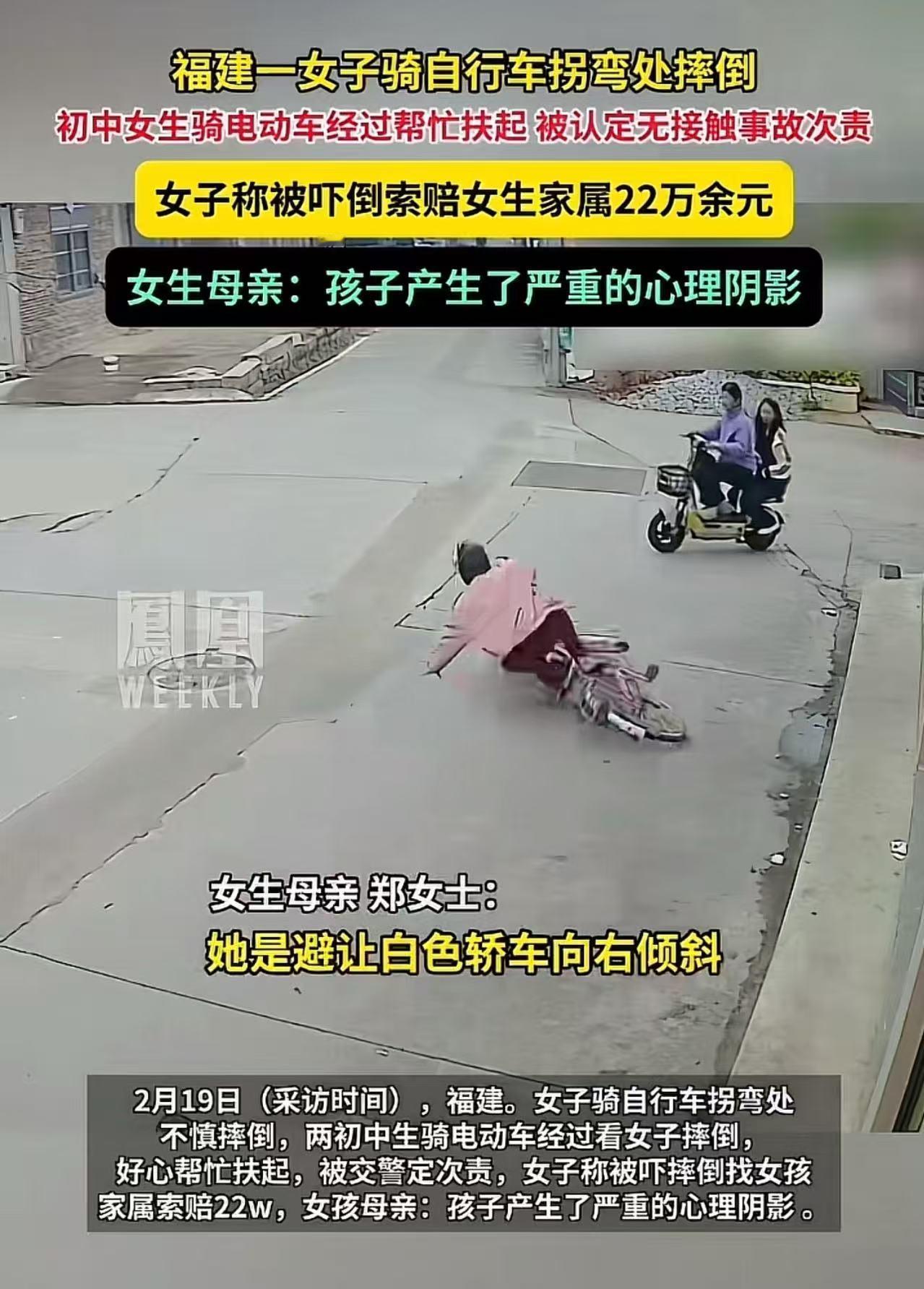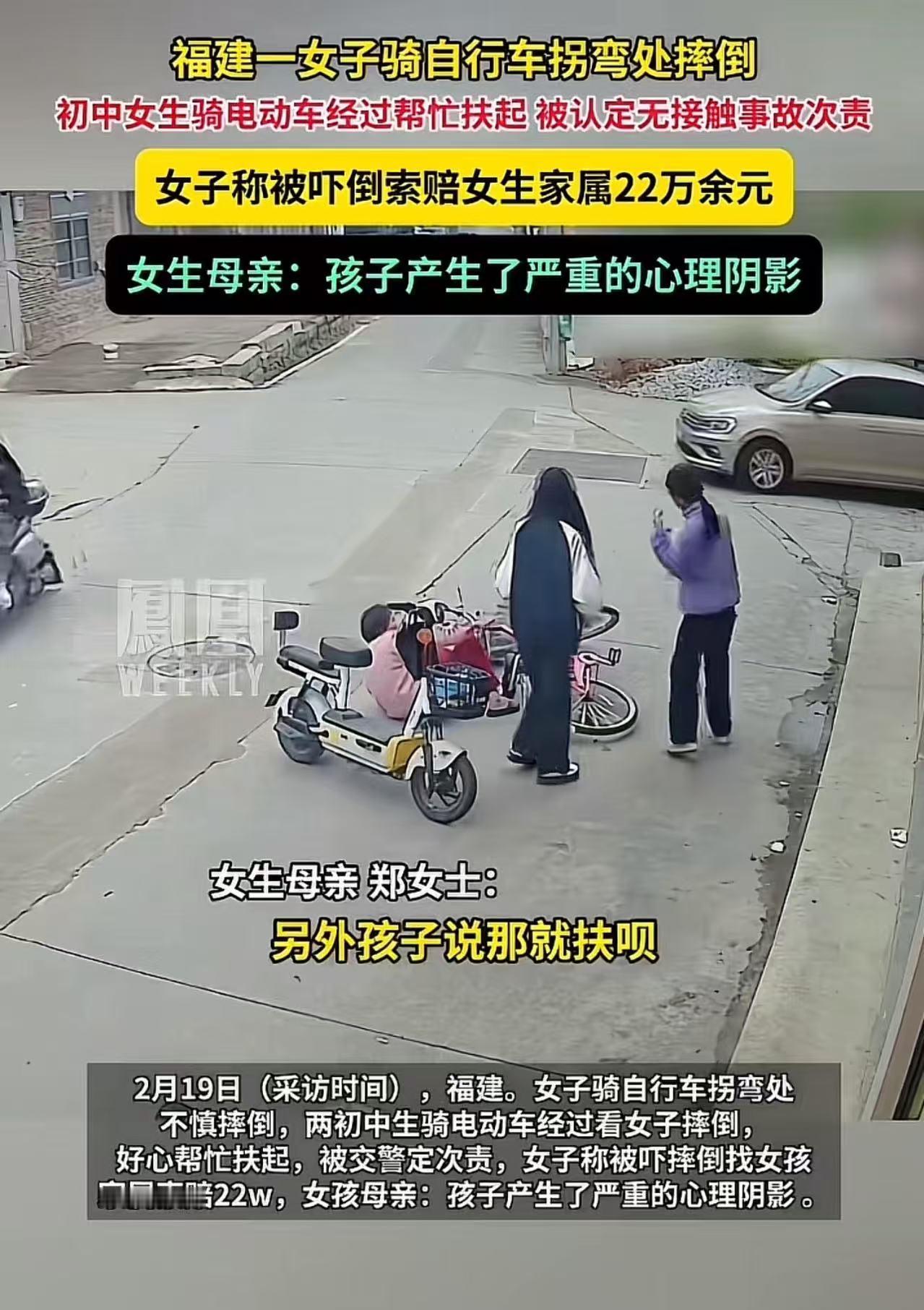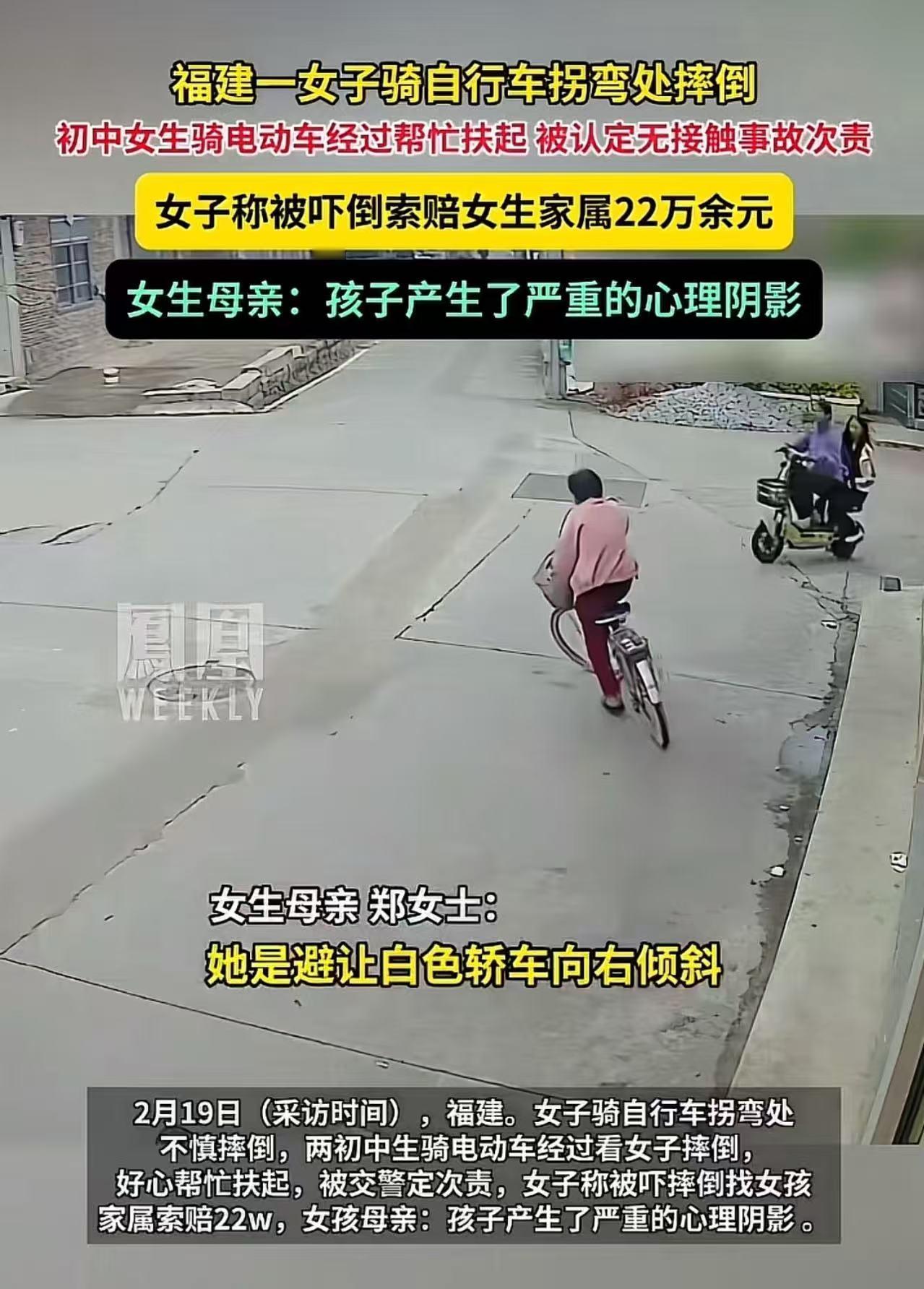 “扶一下被索赔22万!”福建,大妈骑自行车在拐弯处摔倒,初中女生骑电动车经过帮忙扶起,被认定无接触事故次责!大妈索赔22万,女生母亲:“孩子产生了严重的心理阴影!”网友吵翻了! 2025年的一天,福建某街道的拐弯处,大妈骑着自行车,正准备拐弯。突然,一辆白色轿车迎面驶来,她下意识地向右避让,车头一歪,连人带车重重摔在地上。 就在这时,两名初中女生小雅和小琳骑着电动车路过。 "哎,那个阿姨摔倒了!"小琳眼尖,第一个发现。 小雅捏了捏刹车,犹豫了一下:"要不……咱们扶一把?" "扶呗,又没事。"小琳没多想,两人停下车,走过去想把林阿姨扶起来。 谁能想到,这一扶,扶出了22万的索赔单。 林阿姨被扶起后,脸色一变,指着两个女生说:"就是你们突然冲出来,把我吓倒的!" 两个女孩懵了。小雅后来回忆:"我们到的时候,阿姨已经在地上了。我们还在商量要不要扶,谁知道扶了要赔这么多钱……" 交警介入后,认定这是一起"无接触事故",两个女生承担次要责任。 有了这份认定书,林阿姨底气十足,索赔22万。 小雅的妈妈气得发抖:"监控明明显示,她是避让汽车摔倒的!我女儿出现时她已经倒了!现在孩子天天做噩梦,不敢出门,不敢骑车,才十几岁啊,这心理阴影怎么算?" 这件事被发到网上后,评论区直接炸锅,两派观点针锋相对: 【挺女生派】 "好人没好报?以后谁还敢扶?" "老太太这操作太熟了,建议查查有没有前科。" "22万?她怎么不去抢?这摆明了是讹诈!" "应该反诉敲诈勒索,不然以后社会风气更差。" "两个孩子才是受害者,建议给她们颁个见义勇为奖,让老太太公开道歉!" 【挺老人派】 "别急着骂,视频里电动车确实有违章,逆行+没让行,判次责没毛病。" "无接触事故也是事故,法律上说得通。" 电动车确实有责任,左转应该靠右转大弯,而且还要让直行,从视频看电动车一没靠右属于逆行,二没停车让直行,判全责都没毛病! 实事求是的说,还真和骑电动的女孩有关系,没看到避让汽车后,还有个右侧看一下刹车的动作,如果没有电动车就过去了,而且电动车拐弯都到对向车道了,如果不是刹车倒了都可能撞上,属于无接触事故,但是20多万有点过了,还是次责! 【中立分析派】 "找个好律师,起诉交警判责,有胜算。" "核心问题是:女生到达时老人是否已摔倒?监控能看清吗?" "不管责任怎么判,22万明显虚高,法院不会全支持。" "这事儿最伤人的不是钱,是让孩子觉得做好事有罪。" 【观点解析】 这件事最可怕的地方,不在于22万能不能赔,而在于它给社会传递了什么信号。 两个十几岁的孩子,出于本能去帮助一个摔倒的人,结果换来的是索赔、是官司、是心理创伤。你说以后她们再遇到类似情况,会怎么做? 答案是:大概率会犹豫,会后退,会装作没看见。 这不是两个孩子的损失,这是整个社会的损失。 法律上讲"无接触事故"没错,但法律之外还有人情,还有公序良俗。如果每一次善意都要先计算风险,如果每一次伸手都要先想会不会被讹,那这个社会就真的太冷了。 老人摔倒该不该扶?这个问题本身就不该存在。 真正该追问的是:为什么扶人的人总要自证清白?为什么讹人的人违法成本这么低?如果最终判决不能让好人安心、让讹人者付出代价,那输的不是一个案子,是人心。 善意不该有价,更不该有罪。