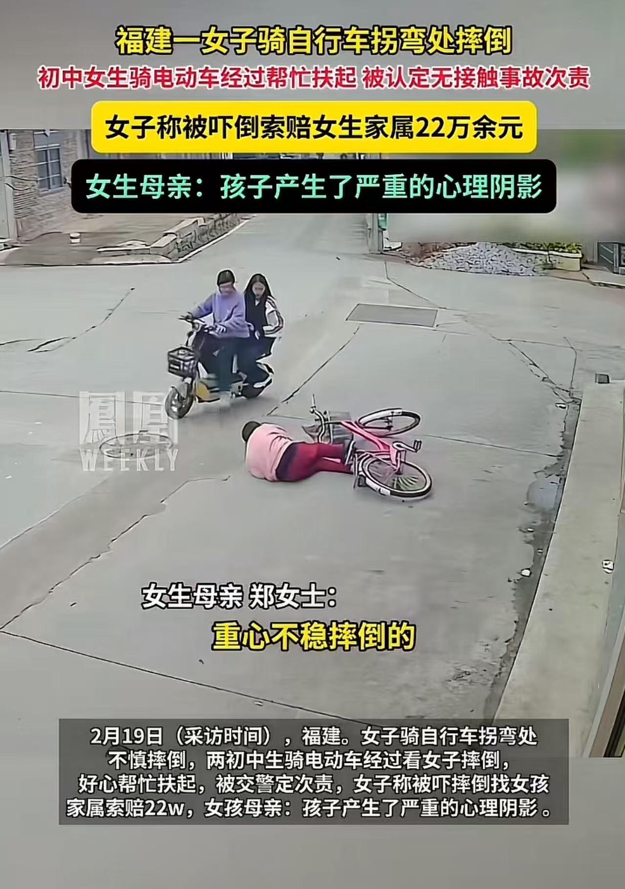 “扶一下被索赔22万!”福建,大妈骑自行车在拐弯处摔倒,初中女生骑电动车经过帮忙