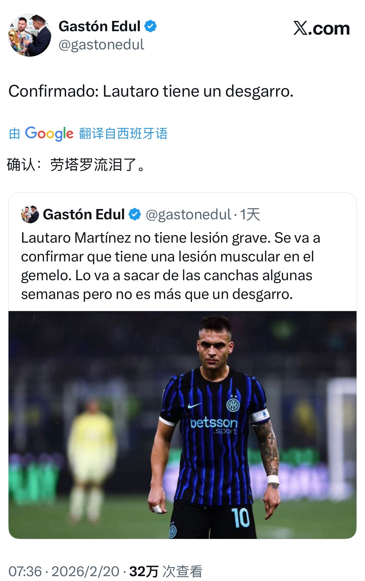 Gaston Edul|劳塔罗小腿肌肉拉伤,至少要缺席20天,但我毫不怀疑他会入
