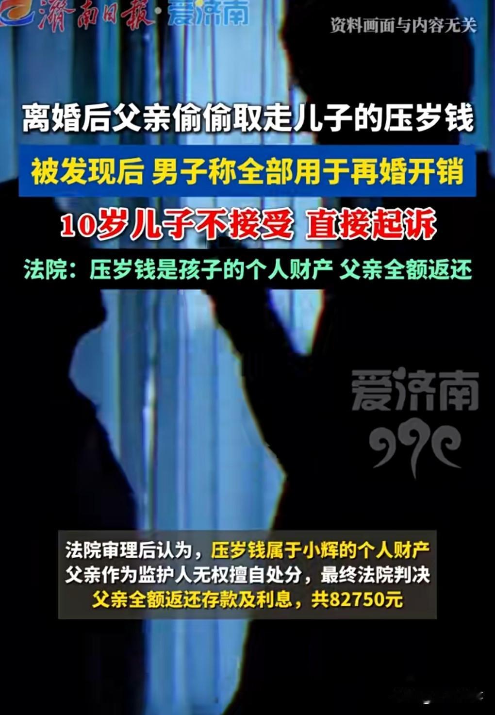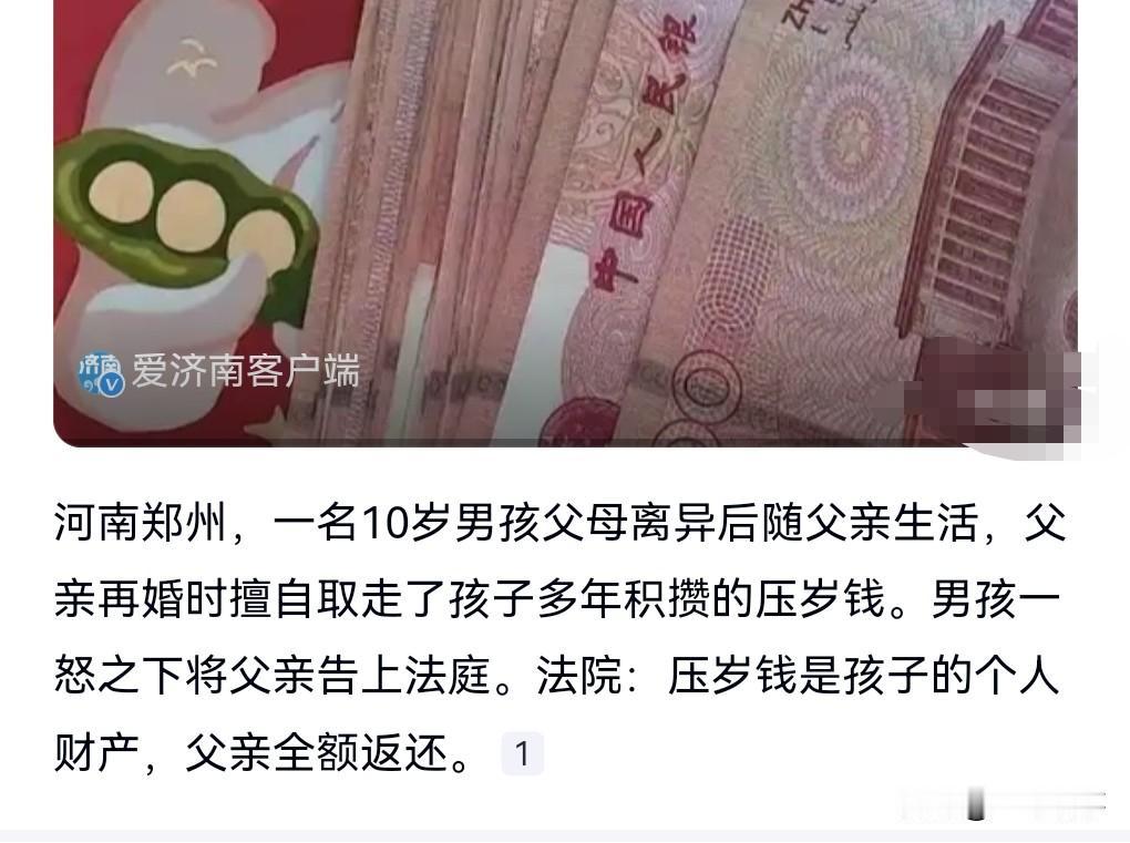 厉害了,想不到10岁的孩子竟然有近10万的压岁钱。 2月20日有这么一个热搜。离婚后父亲偷取压岁钱被10岁儿子起诉。 这个倒是挺新鲜的,因为压岁钱,儿子把爸爸给告了。 当然法律是站在小孩这边的,毕竟给小孩的这钱就是小孩的,父亲只能去保管。 再婚的父亲用这个钱花在了家庭开销上。