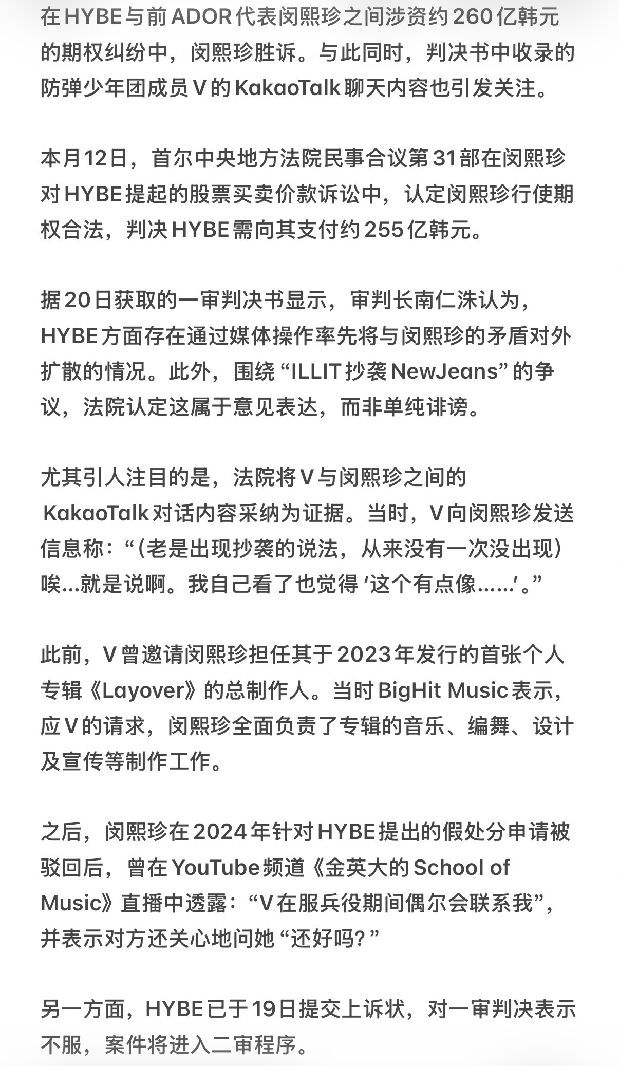 金泰亨称没有打算站在任何一方 金泰亨没有同意对话作为证据提交 据韩媒,金泰亨与闵熙珍聊天内容被采纳为“ILLIT抄袭NewJeans”案证据。金泰亨回应:“那只是我和熟人之间产生共鸣,分享的私人日常对话的一部分。我完全没有想要站在任何一方立场的意图。只是,这段对话在未经我同意的情况下被作为证据提交,让我感到非常错愕。”