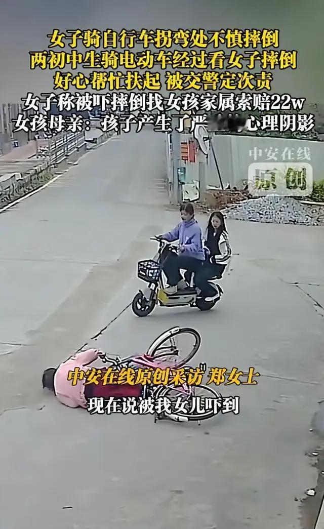 别跟我扯什么监控视频清清楚楚, 也别说什么转弯让直行。 我就问一句:孩子是没满16岁骑电动车不对,但这跟老太太自己没骑稳摔跤,有一毛钱关系吗? 这锅背得,简直是天大的冤枉!看完这事儿,心里真不是滋味。两个初中生,本来是凭着良心去扶人,结果反倒被赖上了,这算哪门子道理? 那个阿姨自己骑车没骑稳,交警的监控都拍得清清楚楚,是她先歪歪扭扭摔倒了,两个孩子才骑车到跟前。这前后脚的工夫,怎么能赖到孩子头上?说是被孩子“吓”摔倒的,这理由也太牵强了。要是照这么说,以后谁还敢走路、骑车?生怕自己一个不小心“吓”到别人,还得赔钱。 更让人想不通的是,交警居然给两个孩子定了个“次责”。孩子是没满16岁骑了电动车,这是不对,可这跟阿姨摔倒有直接关系吗?这锅背得也太冤了。 一句“那就扶呗,又没事”,本来是多善良的本能,现在倒好,直接给孩子整出了心理阴影。以后这孩子看见老人摔倒,怕是想扶都不敢扶了,这不就是把人心往凉了推吗? 现在这社会,有时候真是好人难做。明明是助人为乐,怎么到最后反而成了“过错方”?这22万的索赔单,砸的不只是一个普通家庭,更是砸碎了很多人行善的勇气。 大家说,以后遇到这种事儿,咱们到底该不该扶?这善意的代价,是不是真的太高了?