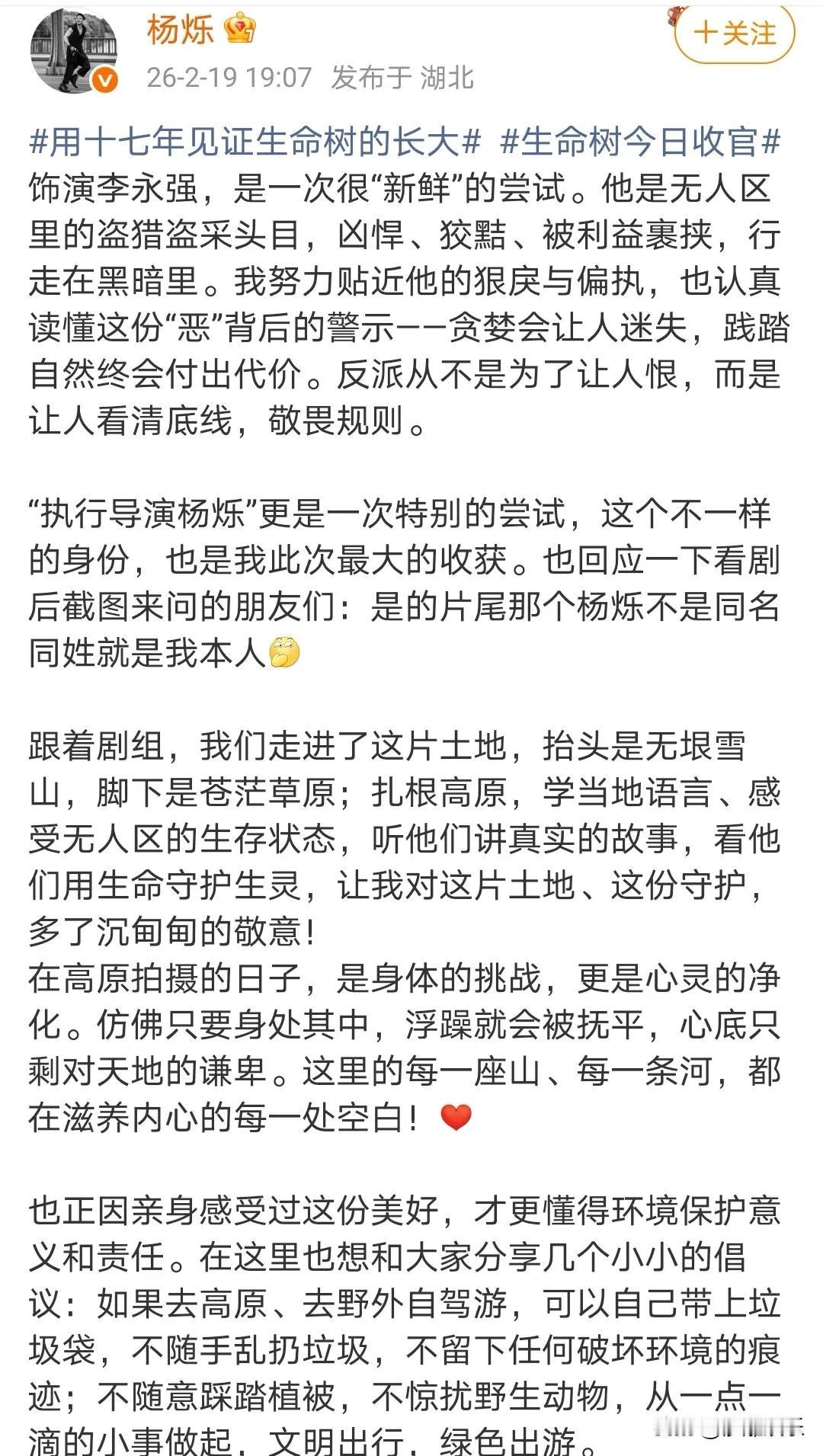 杨烁,双重身份曝光! 杨烁在《生命树》里的“双重身份”:演员只是起点,幕后才是深情 谁能想到,那个在《生命树》里让人恨得牙痒痒的盗猎头子“李永强”,转身在片场却成了最忙的“大家长”? 这几天追《生命树》,很多观众被杨紫和胡歌的演技虐得肝疼,但也有细心的网友发现了一个彩蛋——片尾的“执行导演杨烁”并不是同名同姓的陌生人,就是那个把反派演活了的杨烁本人。 在这个鲜有人知的“第二现场”,杨烁完成了一次低调的蜕变。在海拔4800米的可可西里,当暴风雪来袭,他脱下李永强的“恶人皮”,穿上导演马甲,手把手地教年轻演员如何在极端环境里找镜头,在零下气温里一遍遍走位 。 他说,这片高原“抚平了浮躁,只剩对天地的谦卑” 。演员演戏是本能,但当你开始操心场景调度、关注道具细节、甚至照顾每一个群演的情绪时,那是一种对作品的“大爱”。 从台前的“硬汉”到幕后的“执笔人”,杨烁这一步走得扎实又真诚。角色是短暂的,但创作的生命力是长青的。这一次,他不是在演树,而是在亲手种树 。
