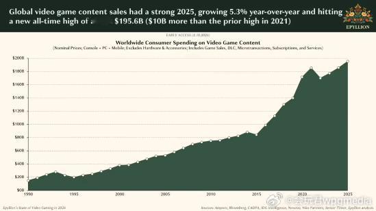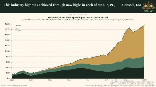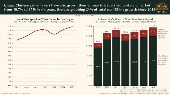 去年中国玩家贡献20%全球游戏支出 84%流向国产游戏一家投资策略公司Epyllion近日公布《2026 年电子游戏现状报告》。报告显示,2025 年全球游戏内容销售总额达到 1956 亿美元(按当前汇率约合 1.35 万亿元人民币),较上一年增长 5.3%,但行业层面的私人资本投入则出现大幅回落,降幅高达 55%。在主机领域,市场增长主要由订阅模式推动。随着 PlayStation Plus 与 Xbox Game Pass 等服务的持续扩张,相关游戏收入升至 416 亿美元,刷新历史纪录;与此同时,传统买断制产品的销量及交易规模同比下降接近 11%。PC 平台则展现出不同走势。尽管近两年的大环境下,整体消费环境趋于保守,但PC 游戏市场并未受到明显拖累,自 2020 年以来累计实现约 30% 的增长。从地区分布看,中国用户在全球支出中的占比达到 20%。其中,本土产品依旧占据绝对主导地位,约 84% 的消费流向国产游戏,海外作品仅获得 16% 的份额。投资方面,除亚马逊等大型企业仍在布局外,不少中小型团队面临严峻压力。一些工作室因融资不足,在项目表现不及预期时难以维持运转,不得不通过裁员与成本控制应对风险。在成本与风险双重考量下,外包正成为越来越多开发商的选择。业内普遍认为,随着资金趋紧与回报不确定性上升,游戏产业正进入结构调整阶段,而中小团队的经营空间也随之进一步收缩。