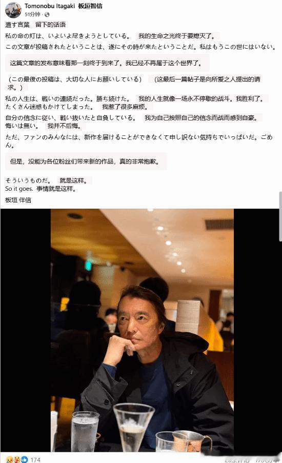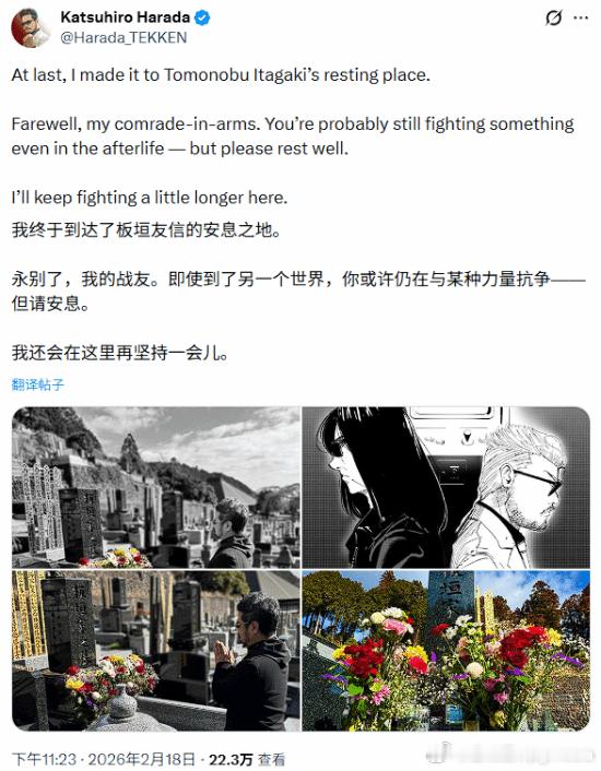 原田胜弘为坂垣伴信扫墓:永别了 并肩作战的战友2025年10月16日,曾开发过《死或生》、《忍者龙剑传》系列的知名游戏制作人“硫酸脸”板垣伴信的亲友在脸书上宣布了其去世的消息,并附上了板垣伴信留下的寄语。近日,与板垣伴信私交甚笃的《铁拳》系列制作人原田胜弘在社交媒体上透露,自己前往了板垣伴信安息之处为其扫墓,他同时还分享了一段悼念的文字,以及几张这位传奇制作人长眠之地的照片。他表示:“终于,我来到了板垣伴信的安息之地。永别了,并肩作战的战友。就算是在另一个世界,你大概也还在和什么战斗着吧——不过,请好好休息。我会在这边,再继续战斗一段时间。”