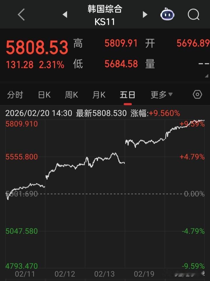 两天就狂涨5.4%,严厉抗议“韩国股市”这种一点不为投资者负责考虑的行为,这种持续近一年的单边上涨狂牛疯牛式行情(2025年4月9日底点2284点,到今的5809点,211个交易日上涨超148%),难道就不怕风险不怕泡沫被刺破的吗? 马跃龙门,一马当先,快马加鞭,马不停蹄,天马行空... 中国的成语都被韩国的股市抢先用上了,那我们自己的马年开门股市节后又用什么成语呢?