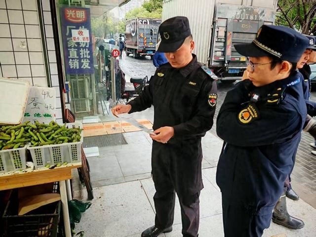 头图:刘振龙(左一)配合城管执法给商户发放告知书。