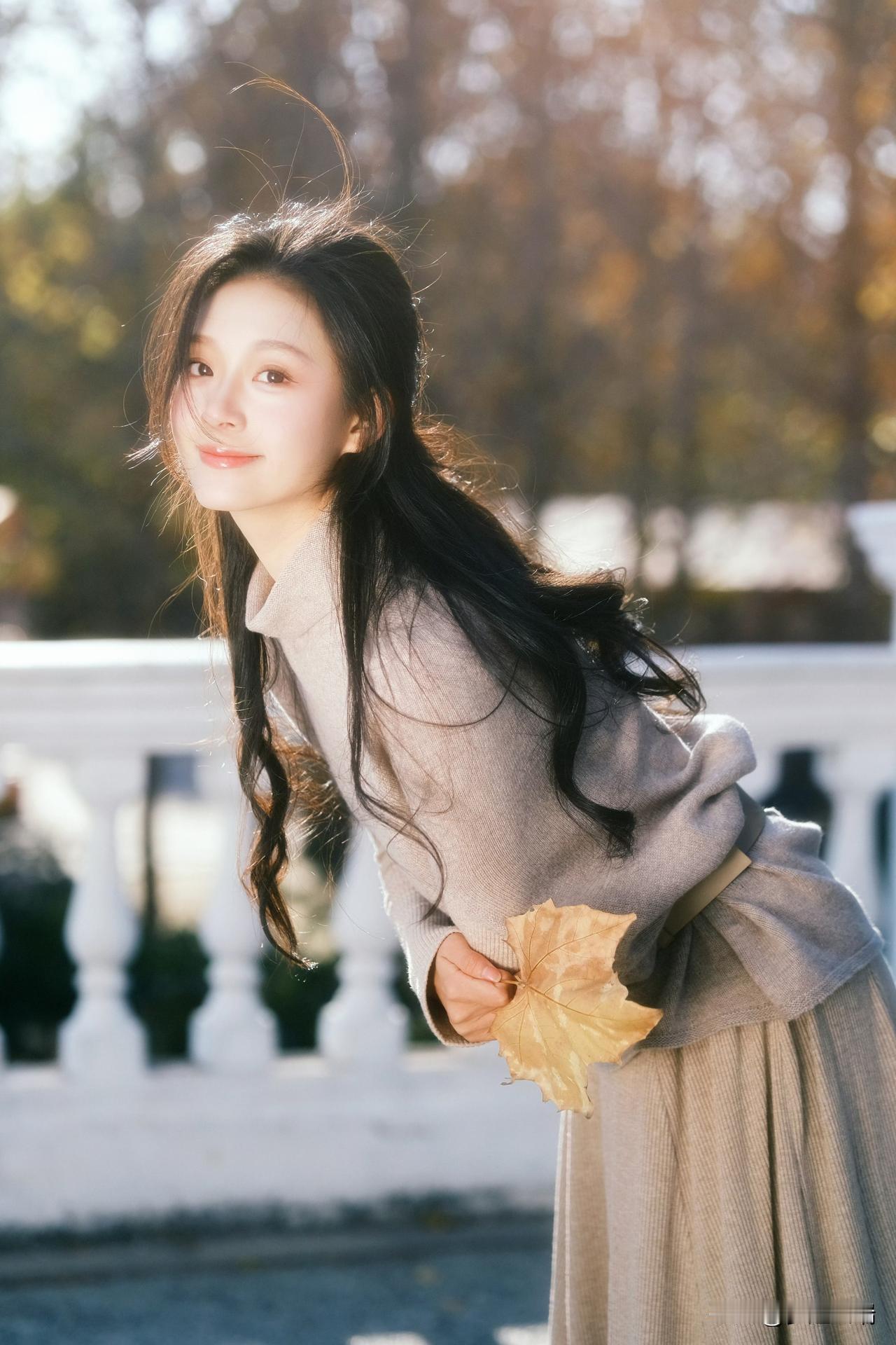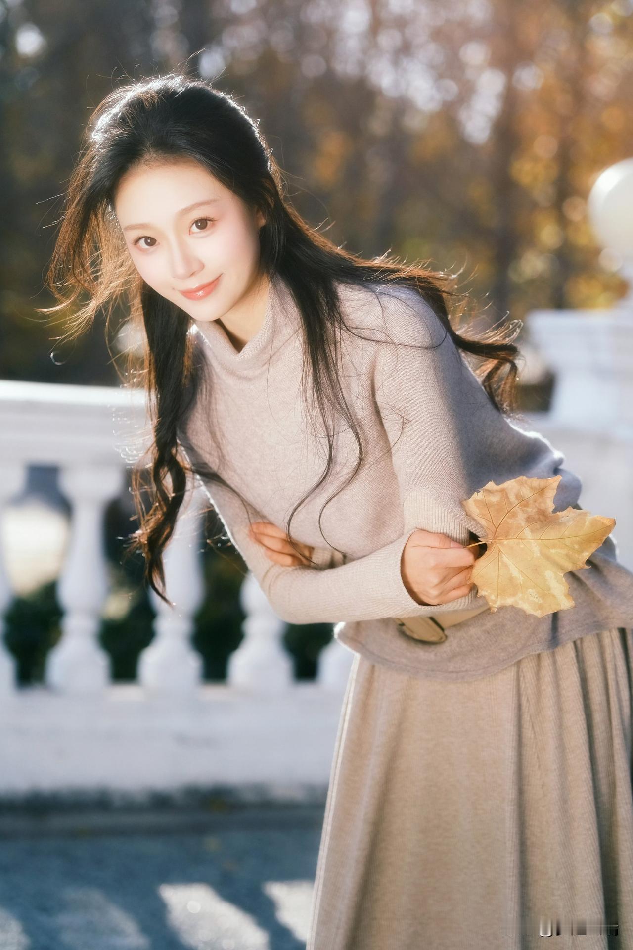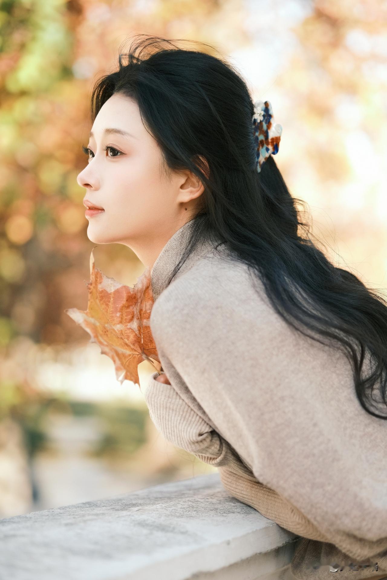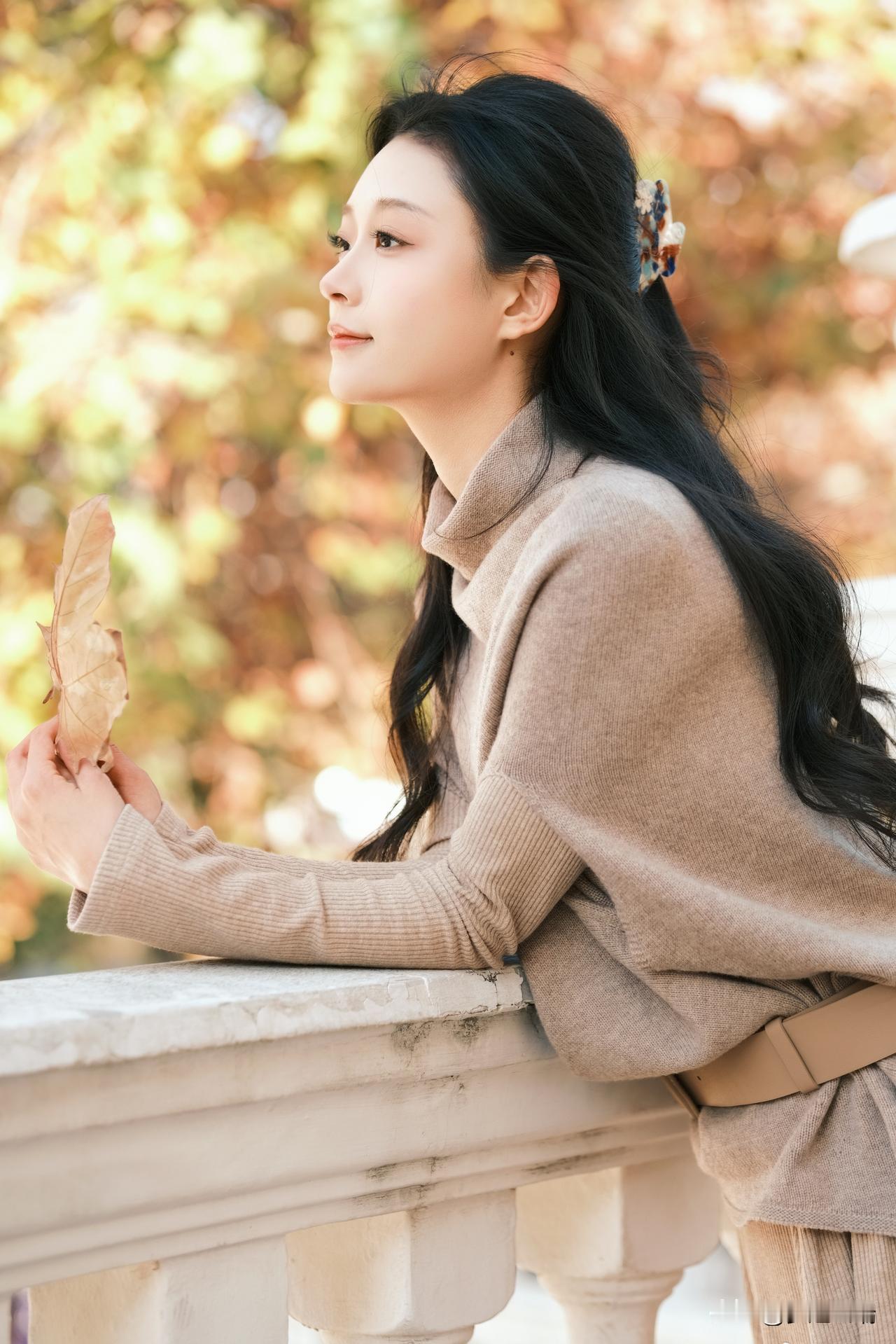 秋日暖阳下,少女轻倚栏杆,手捧落叶,静享时光。