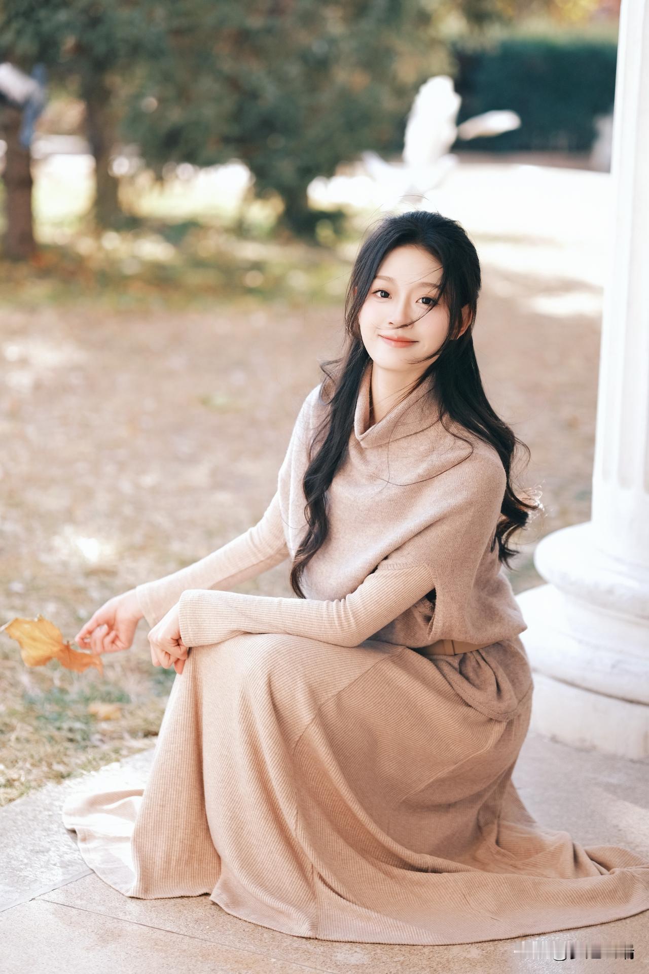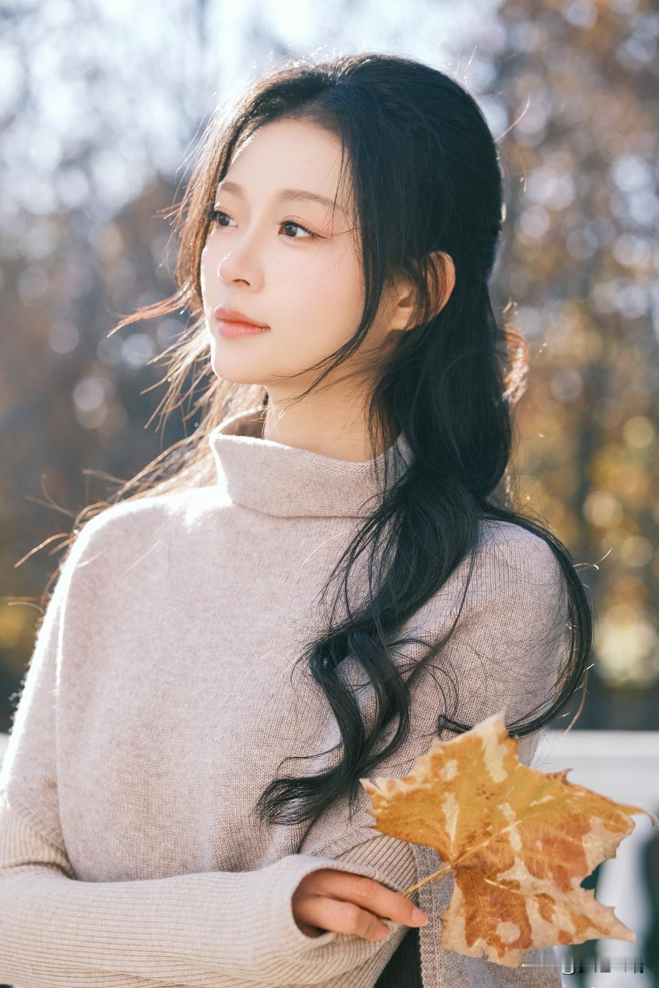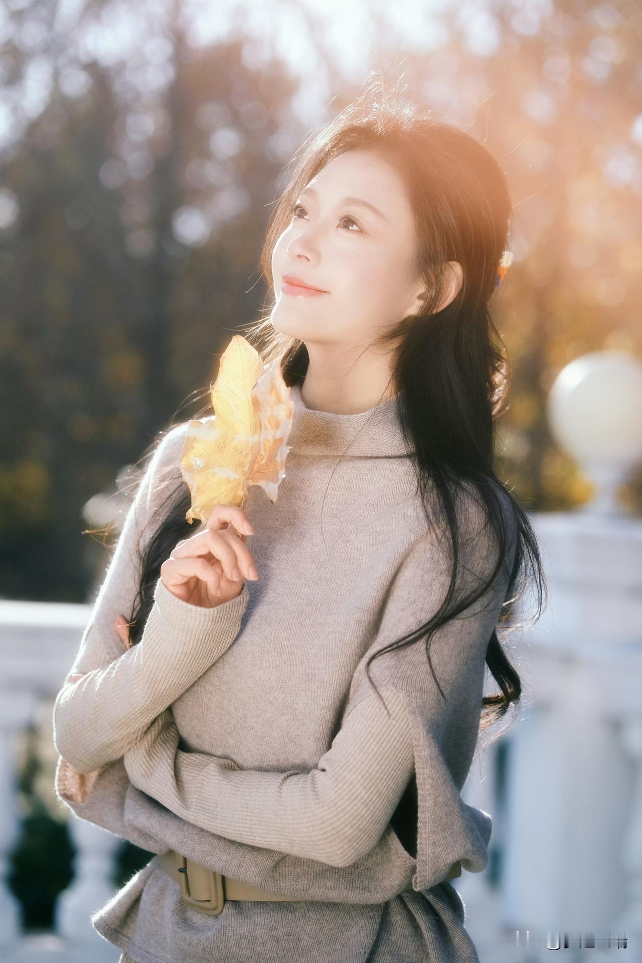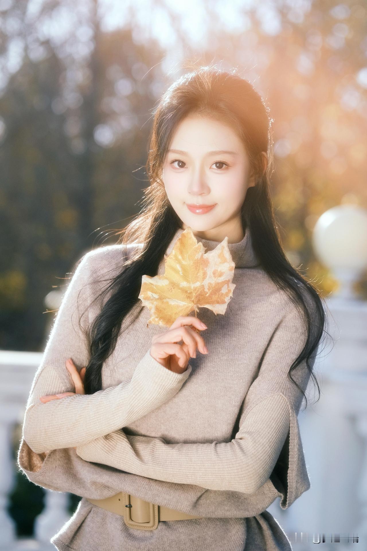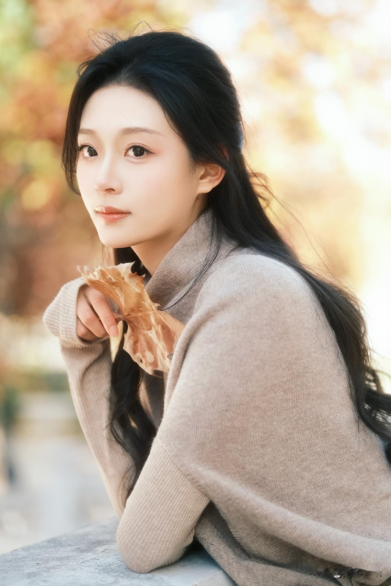 秋日暖阳下,少女轻倚栏杆,手捧落叶,静享时光。