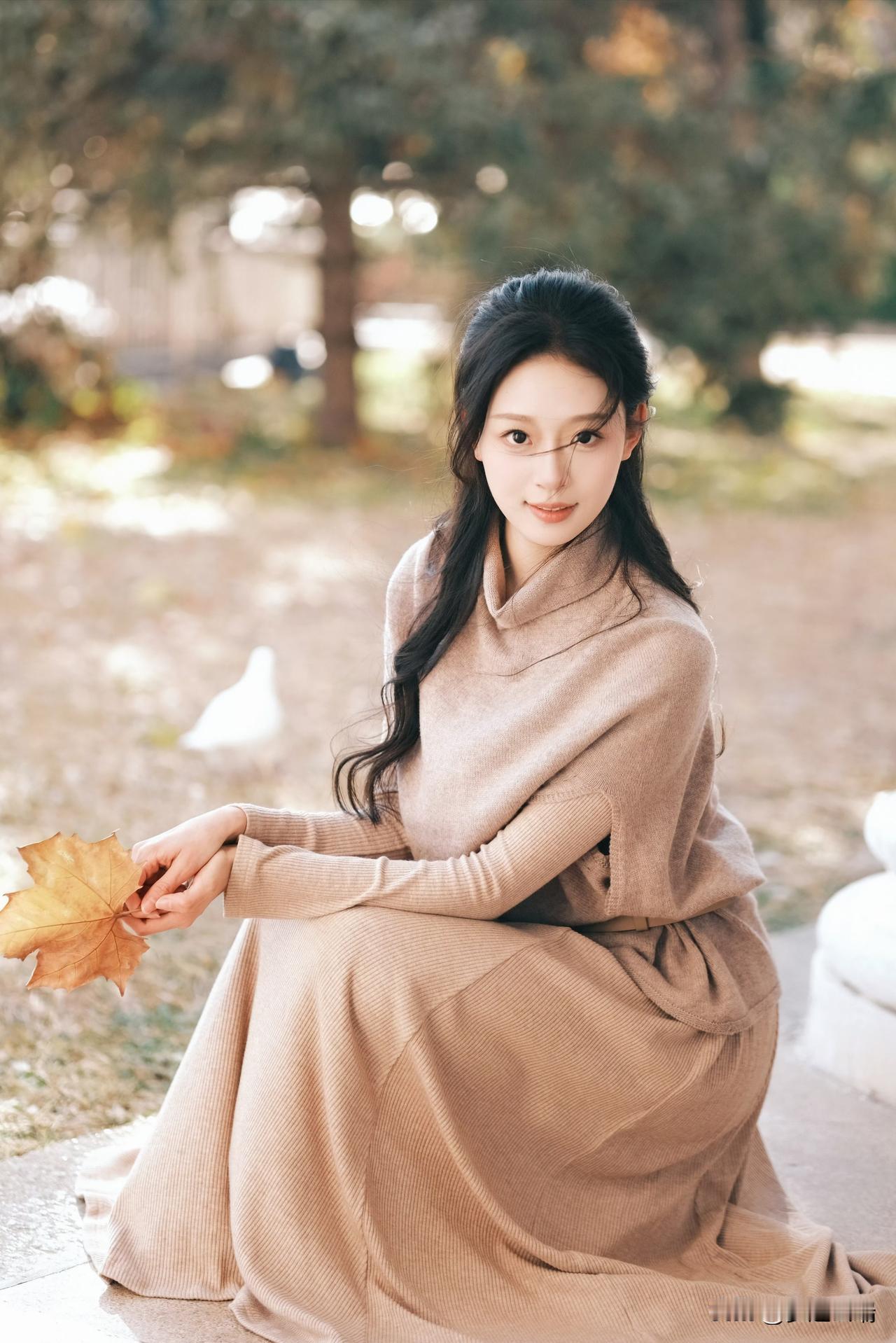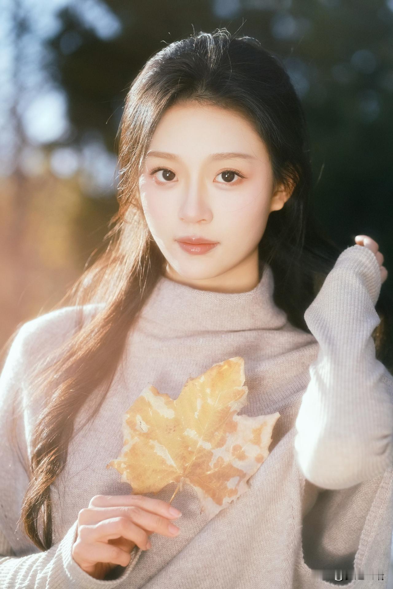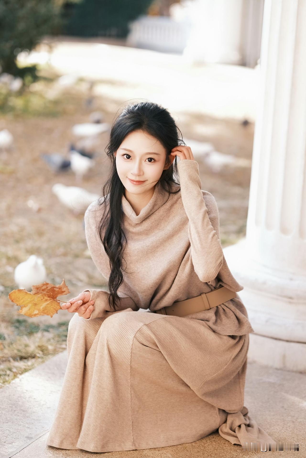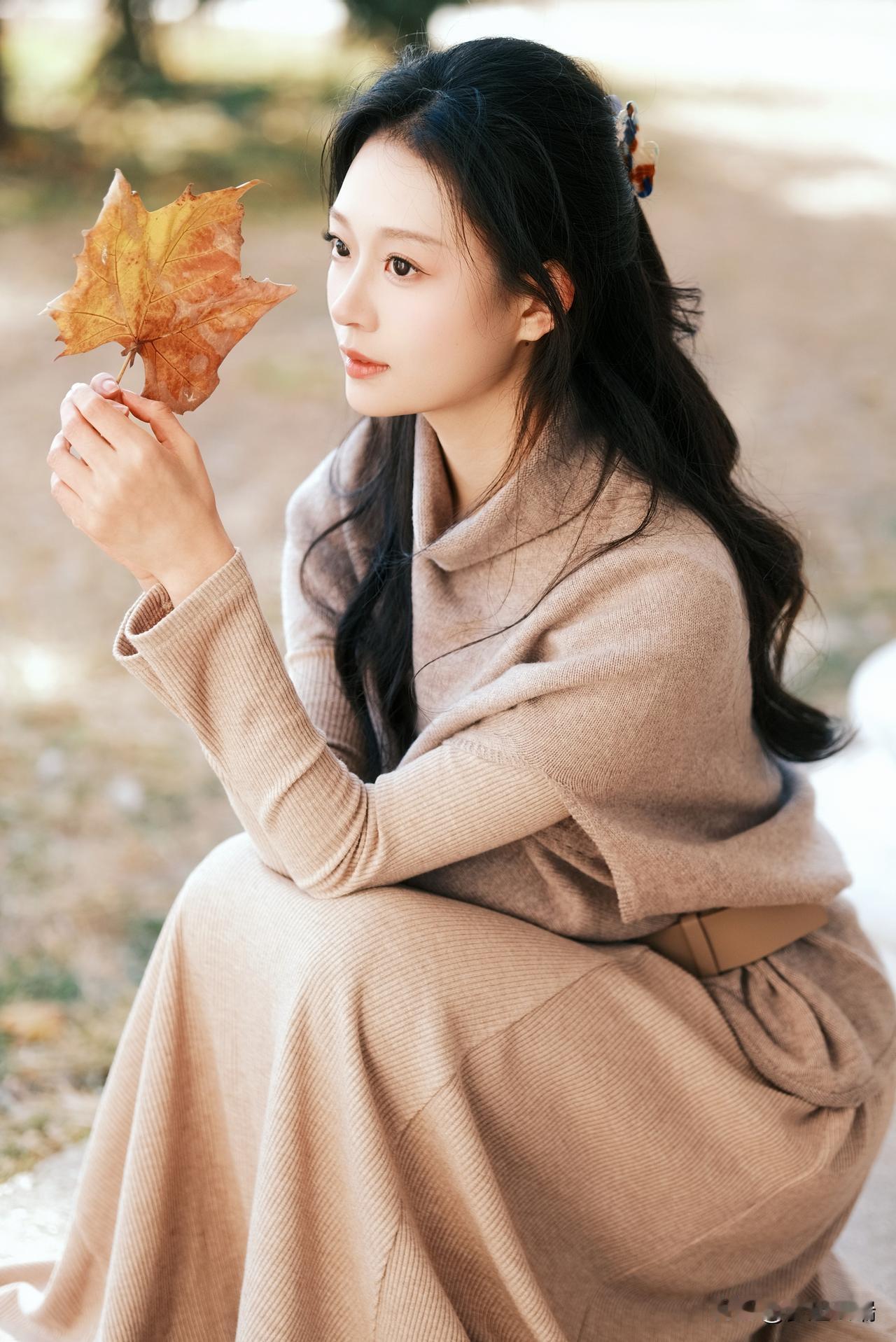 秋日暖阳下,少女轻倚栏杆,手捧落叶,静享时光。