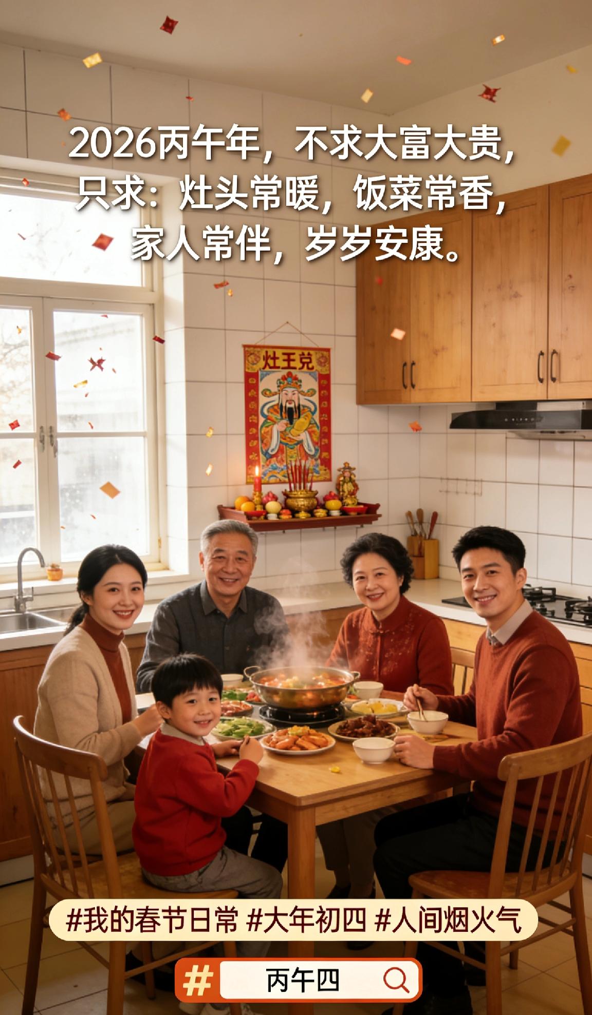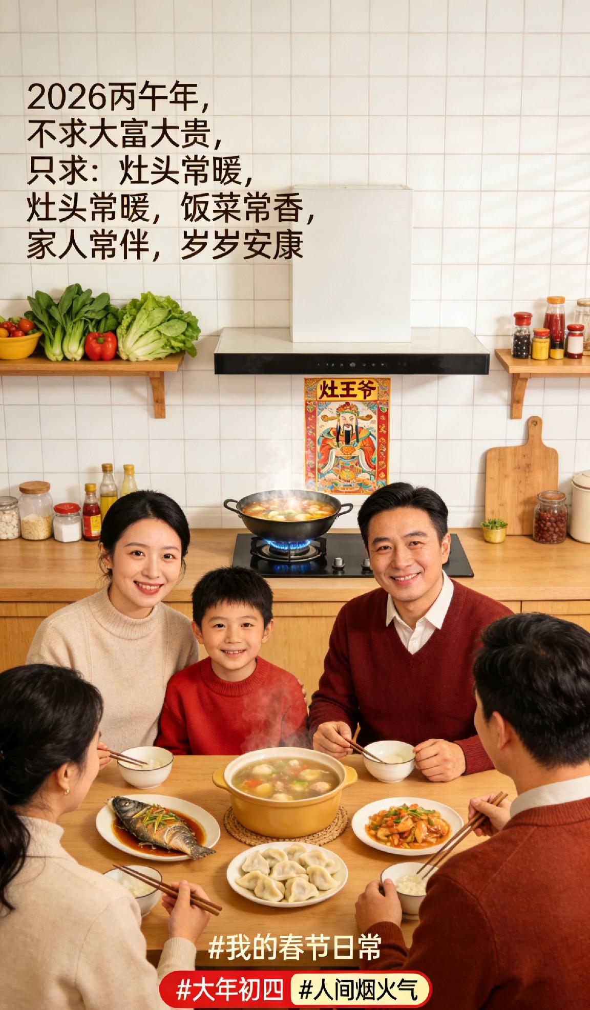 大年初四|烟火气里的年味,才最动人✨ 初一的鞭炮,初二的酒,初三的懒觉,到了初四,终于回归了灶台的烟火气。 把厨房收拾得干干净净,准备迎接灶王爷。 没有了走亲访友的忙碌,只有一家人围坐在一起吃顿热乎饭的安稳。 2026丙午年,不求大富大贵,只求: 灶头常暖,饭菜常香,家人常伴,岁岁安康。 这就是我想要的马年,简单又美好。 我的春节日常 大年初四