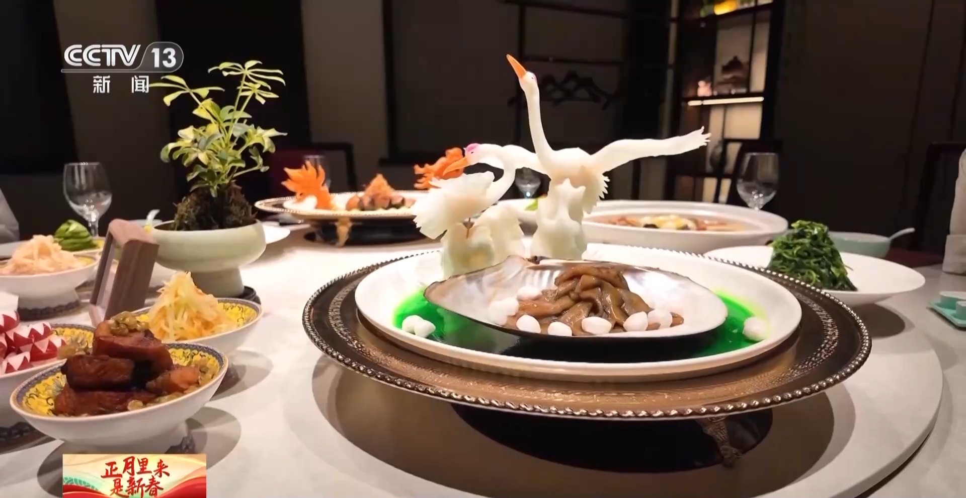 中国淮扬菜博物馆吴叶青:实际上宴会里面是一道头菜,谐音就是头彩,寓意家庭幸福,团圆美满。飞禽走兽水中鲜,菌菇蔬菜一并全,小火慢炖成美餐。