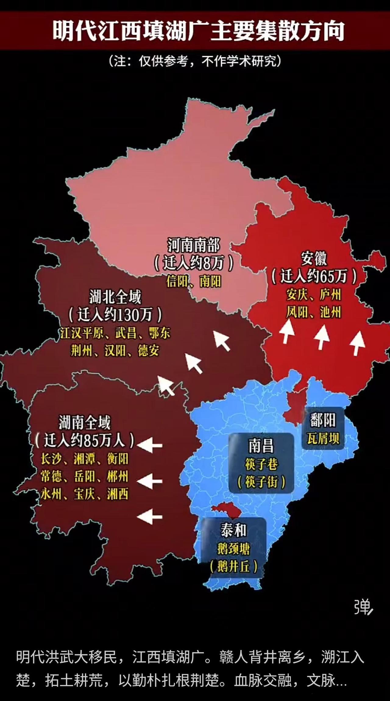 明代“江西填湖广”是洪武时期规模宏大的人口迁徙运动。图中以白色箭头清晰标示了移民从江西(蓝色区域)向湖广(今湖南、湖北,红色与棕色区域)的主要流向。数据标注显示,湖北全域接纳移民约130万人,湖南约85万人,直观呈现了移民规模的空间分布。这一迁徙是明初恢复湖广地区经济、平衡人口与土地的重要政策结果。江西因人口相对稠密成为主要迁出地,移民溯长江而上,填补了战后湖广的人口空缺。他们拓荒垦殖,不仅推动了当地农业与经济复苏,也促进了江西与湖广之间文化、血缘的融合,对两湖地区的方言、习俗及社会结构产生了深远影响。图中信息简明扼要,突出了移民的流向与规模,虽注明“仅供参考”,但仍生动勾勒出这场历史大迁徙的空间格局与历史意义。