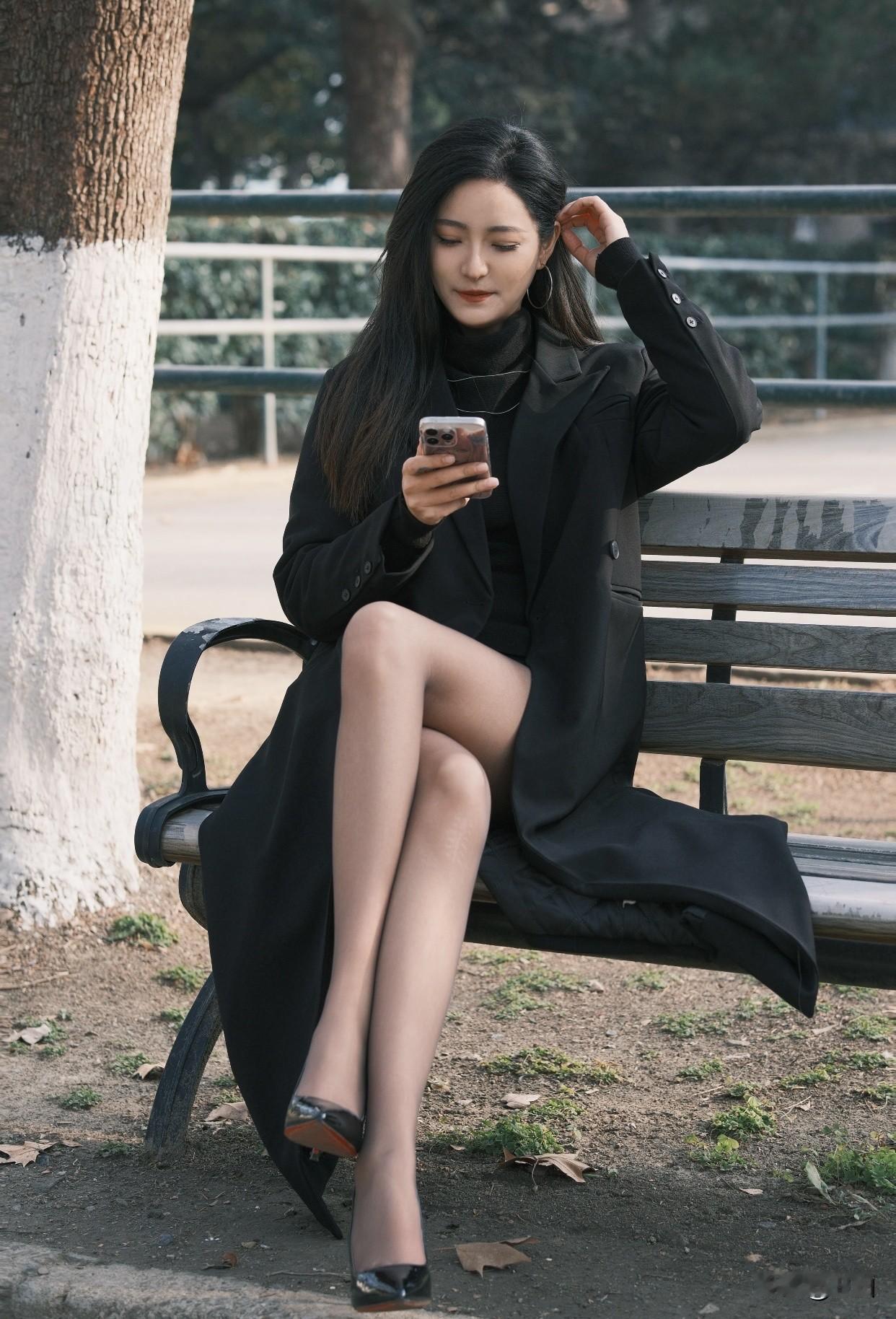 治愈系少女写真怎么拍秋日午后,黑衣女子静坐长椅,沉思手机,岁月静好。