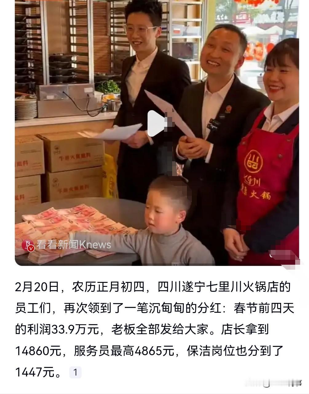 别人家的老板就是给力呀。 2月20日热搜,火锅店春节4天赚33.9万全给员工。 跟着这样的老板干的都起劲。 赚这么多钱都分给了员工,那这员工太爽了。 哪怕就算是春节上班,那也挺开心的。 店长分了1万多,服务员4000多,保洁的也有1000多。