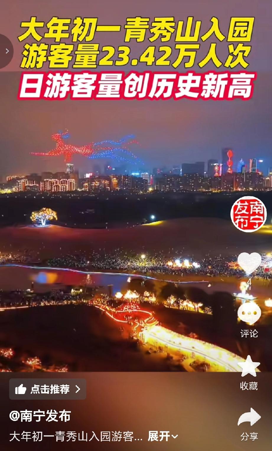 今年2026年农历马年大年初一(2月17日),南宁青秀山风景区单日入园游客量达23.42万人次,刷新景区历史单日客流纪录 。当天青秀山推出了丰富的新春活动,东区丘石花园有超12万盆七大色系的郁金香展,搭配“马上有喜市”可赏花、购物、品美食;北门等区域的迎春花市汇集近110种年宵花 。夜幕降临后,1430亩的新春灯会点亮,70余组大型灯组亮相,还有上千架无人机编队表演、国家级非遗打铁花、智能机器人巡游等特色体验,景区全程安全有序,年味十足 。此外,青秀山初一初二累计入园游客量已突破35万人次,迎来新春文旅“开门红” 。(来源于@南宁发布)