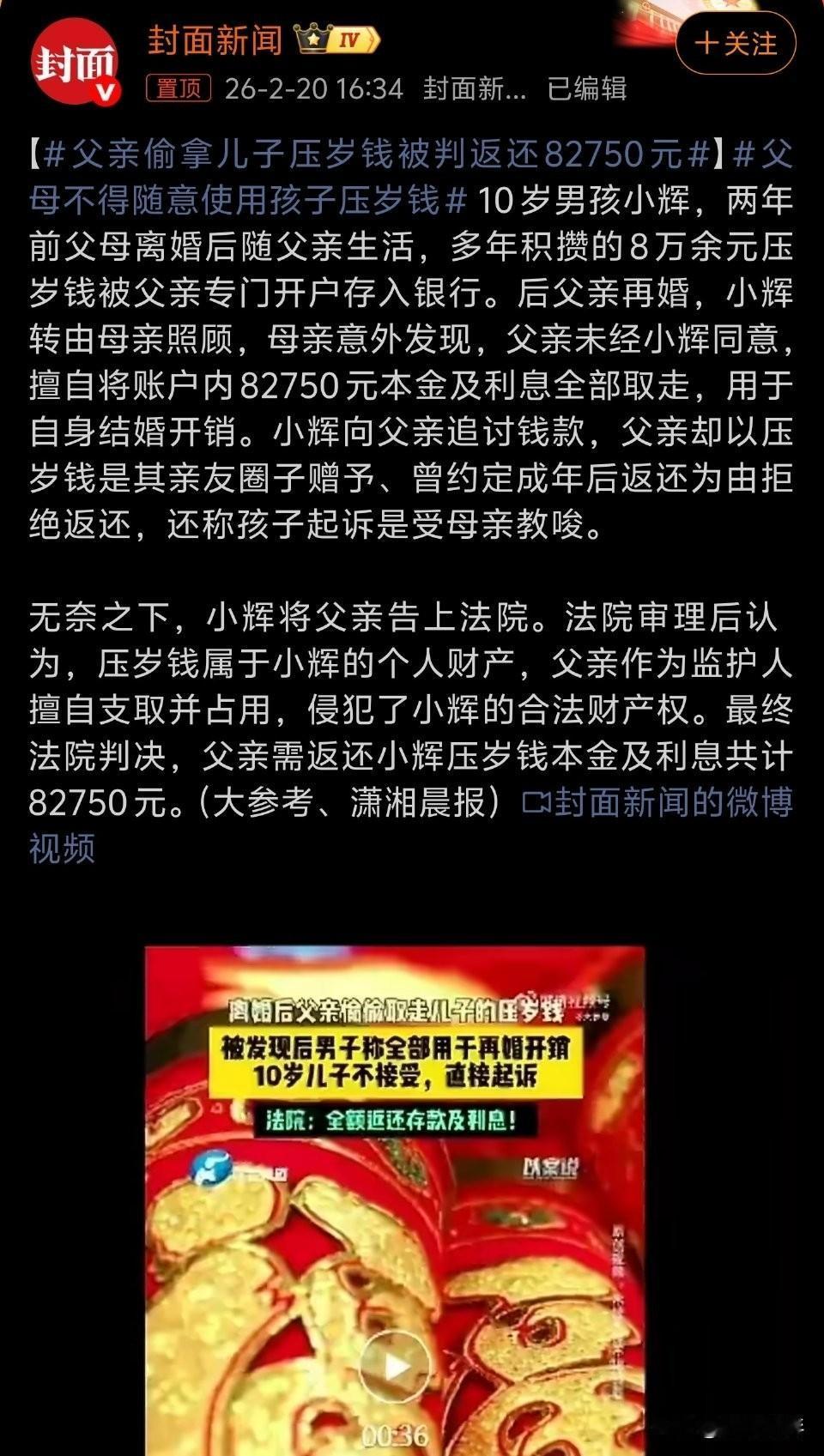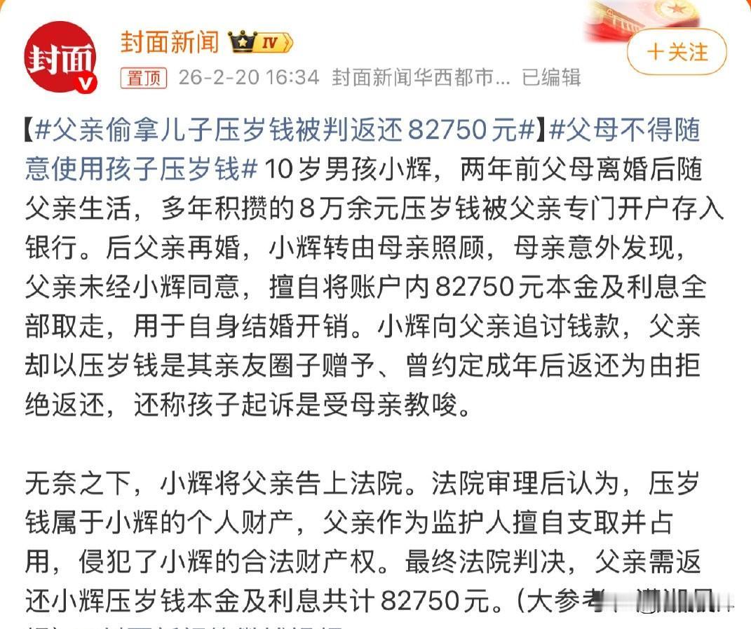 法律早已明确:压岁钱是长辈对孩子的单独赠与,属于未成年人个人财产,父母仅可代为保管,无权擅自挪用、侵占。《民法典》规定,监护人除为维护被监护人利益外,不得处分其财产。父亲将钱用于自身婚事,明显侵犯孩子权益,判决合法合理。 这不是“父子算账”,而是法治与亲情的边界课。很多家长把“帮你存着”变成“归我所有”,忽视孩子的财产权与人格尊重。判决既守护未成年人合法权益,也警示所有家长:亲情不能凌驾法律,监护权不是支配权。 案件也提醒大众:权利不分年龄,财产不分大小。愿家长们守住底线,把压岁钱变成财商教育与信任传承,而非亲情裂痕。