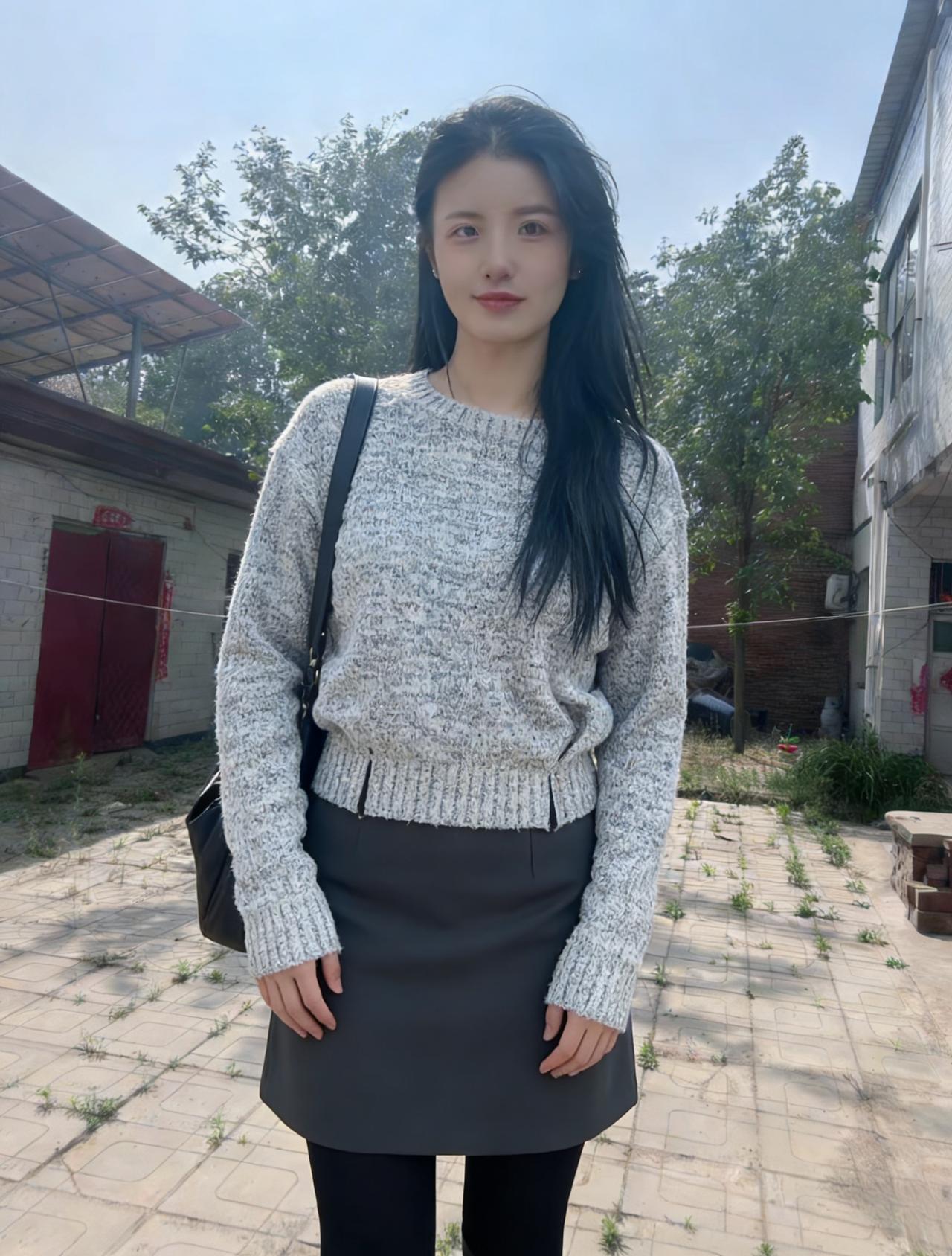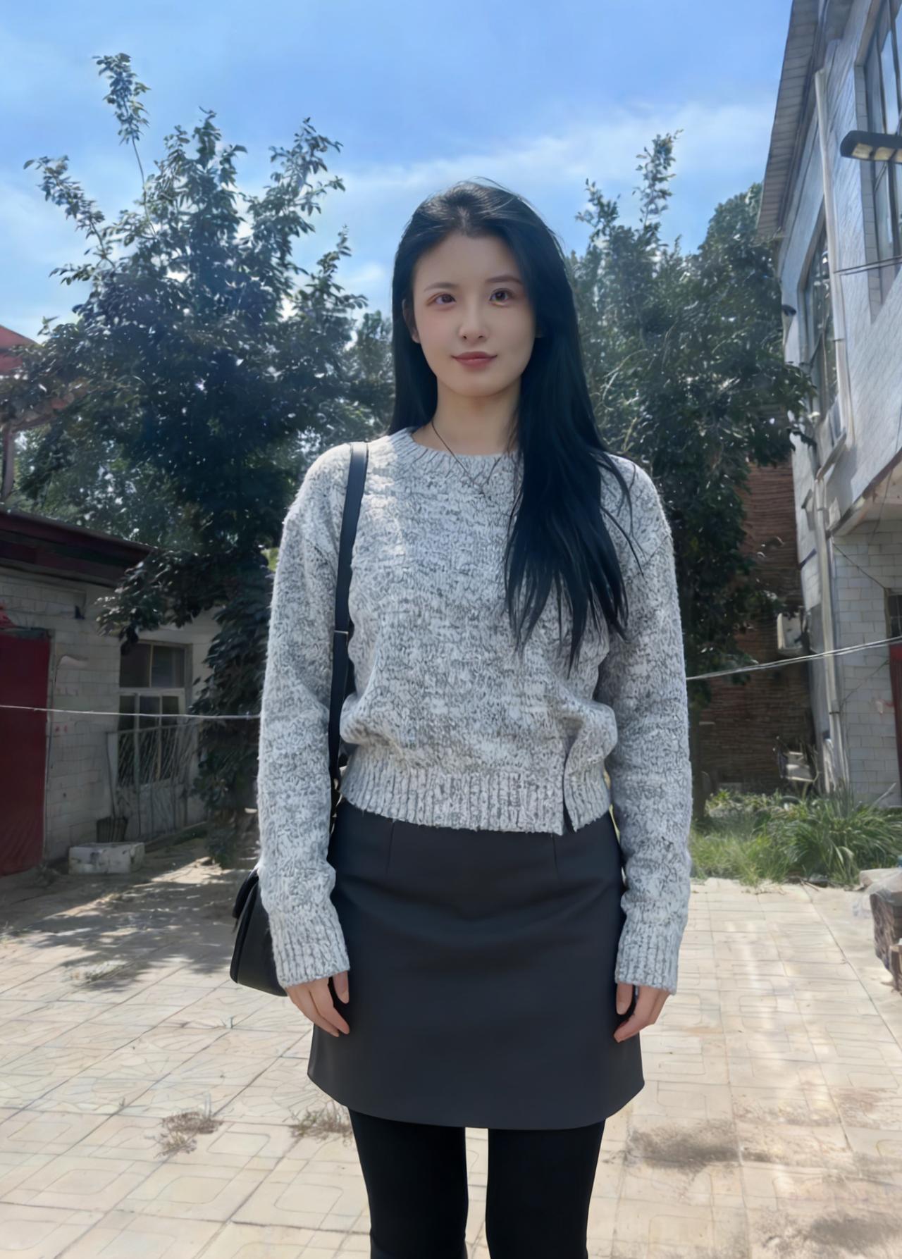 瓦舍疏林接远丘,佳人闲立最温柔。 素绒裁就轻盈影,黑发飘成婉转流。 眼底无尘藏皓月,衣间有韵度清秋。 乡隅自有倾城色,淡墨轻烟画未休。