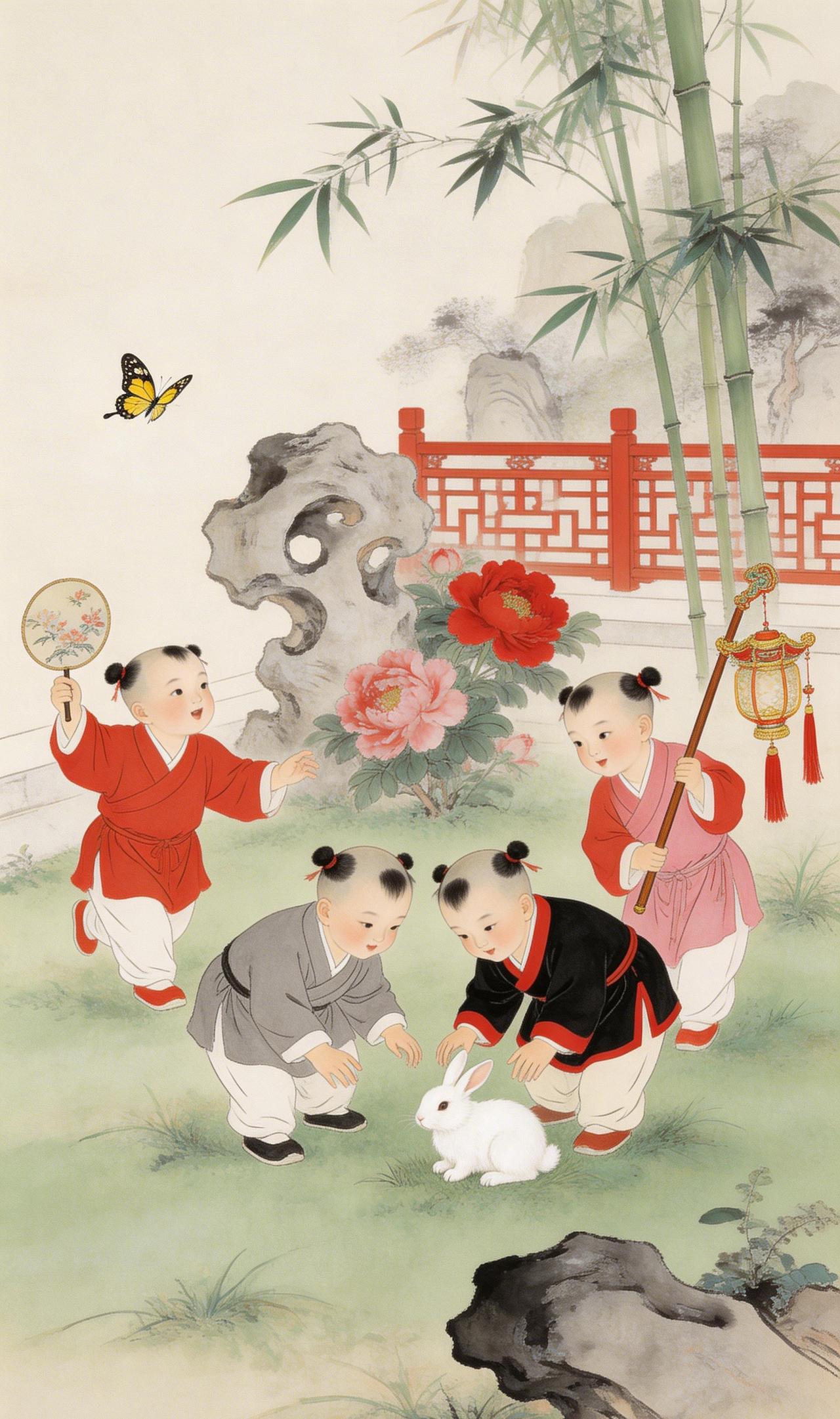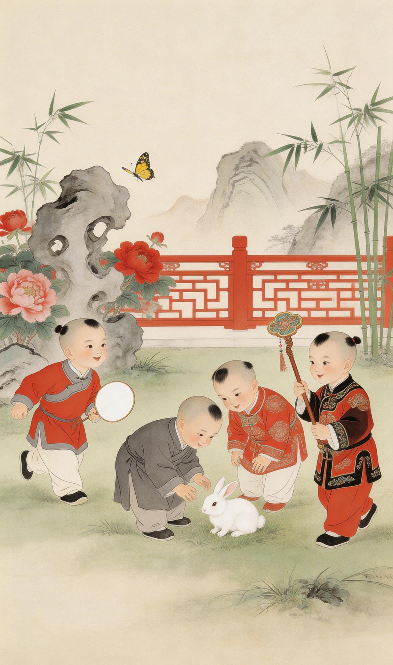 庭前稚子嬉春早,满院吉光映华年 竹影摇红,庭深岁暖。 这幅工笔小景里,藏着中国人最极致的年节欢喜。红衣稚子追蝶逗兔,手提宫灯踏春而行,牡丹盛放映着朱栏,太湖石旁尽是天真。 古人的年味,从不是喧嚣鼎沸,而是这般雅致的热闹。孩童的笑闹是 “多子多福” 的期许,玉兔踏春是 “顺遂安康” 的吉兆,翠竹牡丹则暗合 “节节高升” 与 “富贵满堂”。 一院春色,满堂祥瑞。 借这古意盎然的吉兆,祝各位: 丙午马年,龙马精神! 家中稚子聪慧,岁岁平安; 庭前花开富贵,万事胜意。
