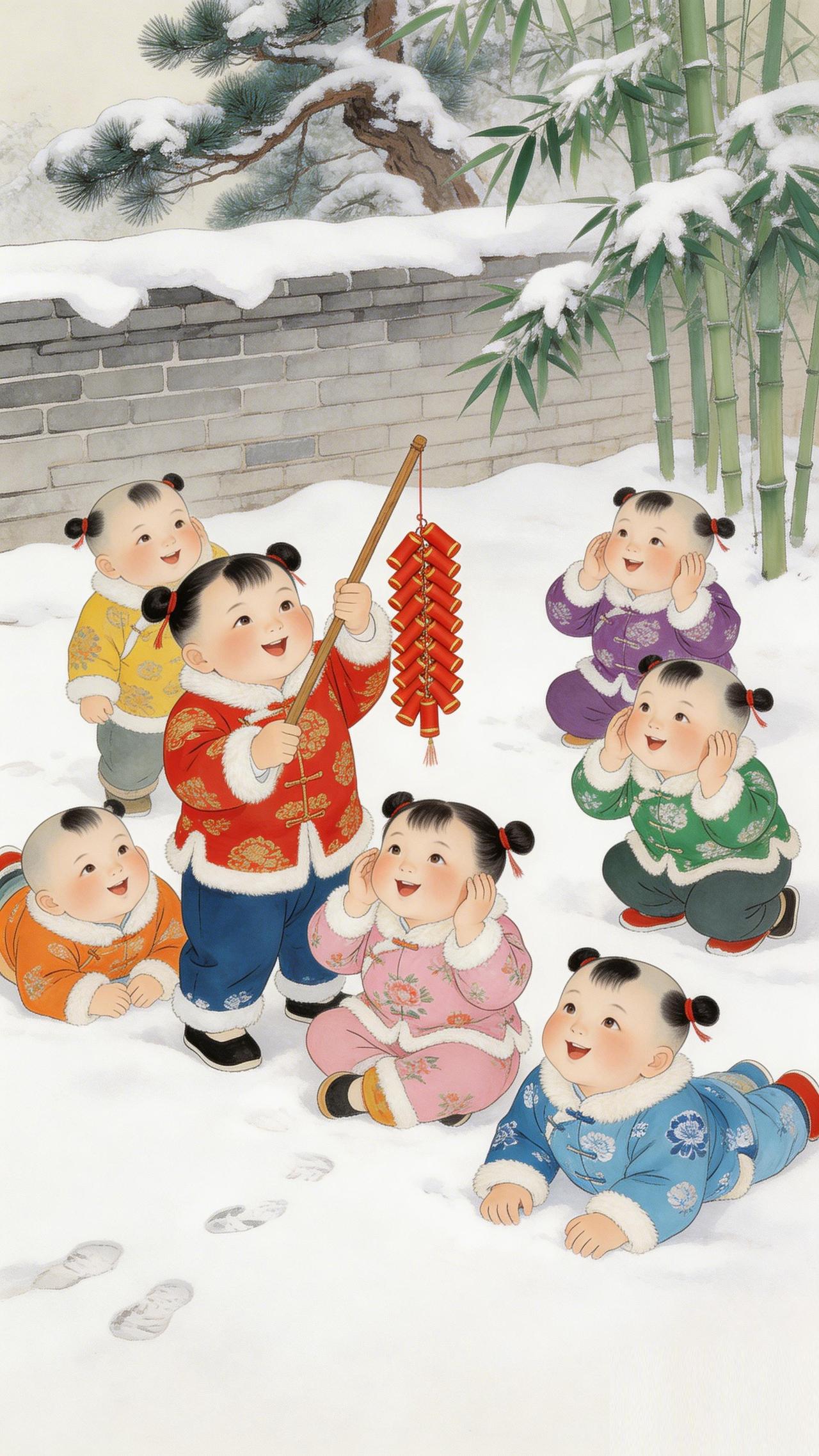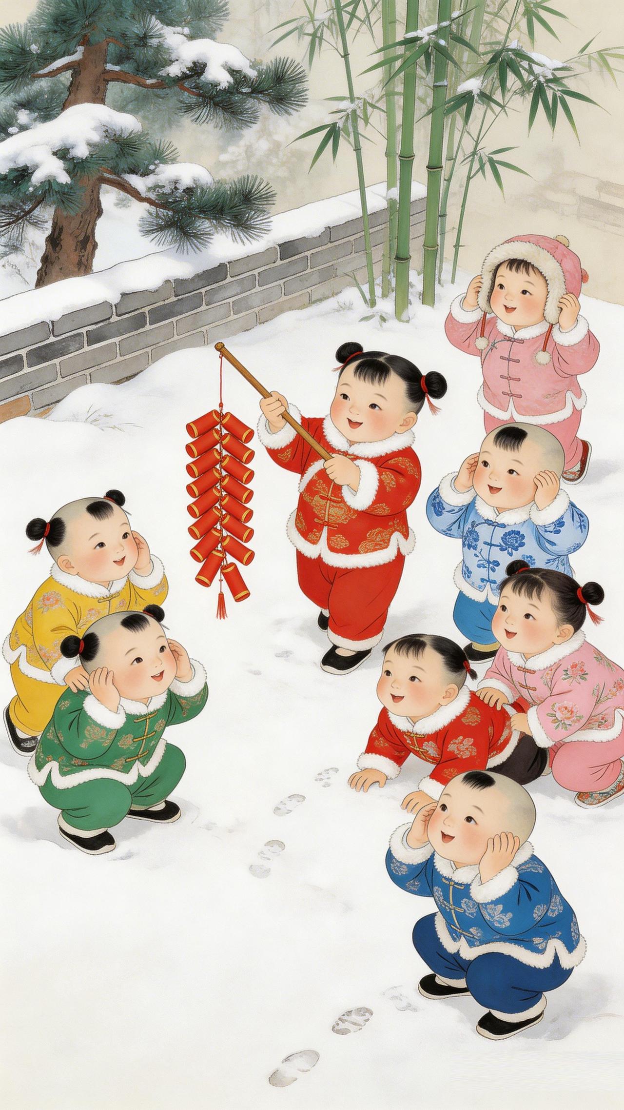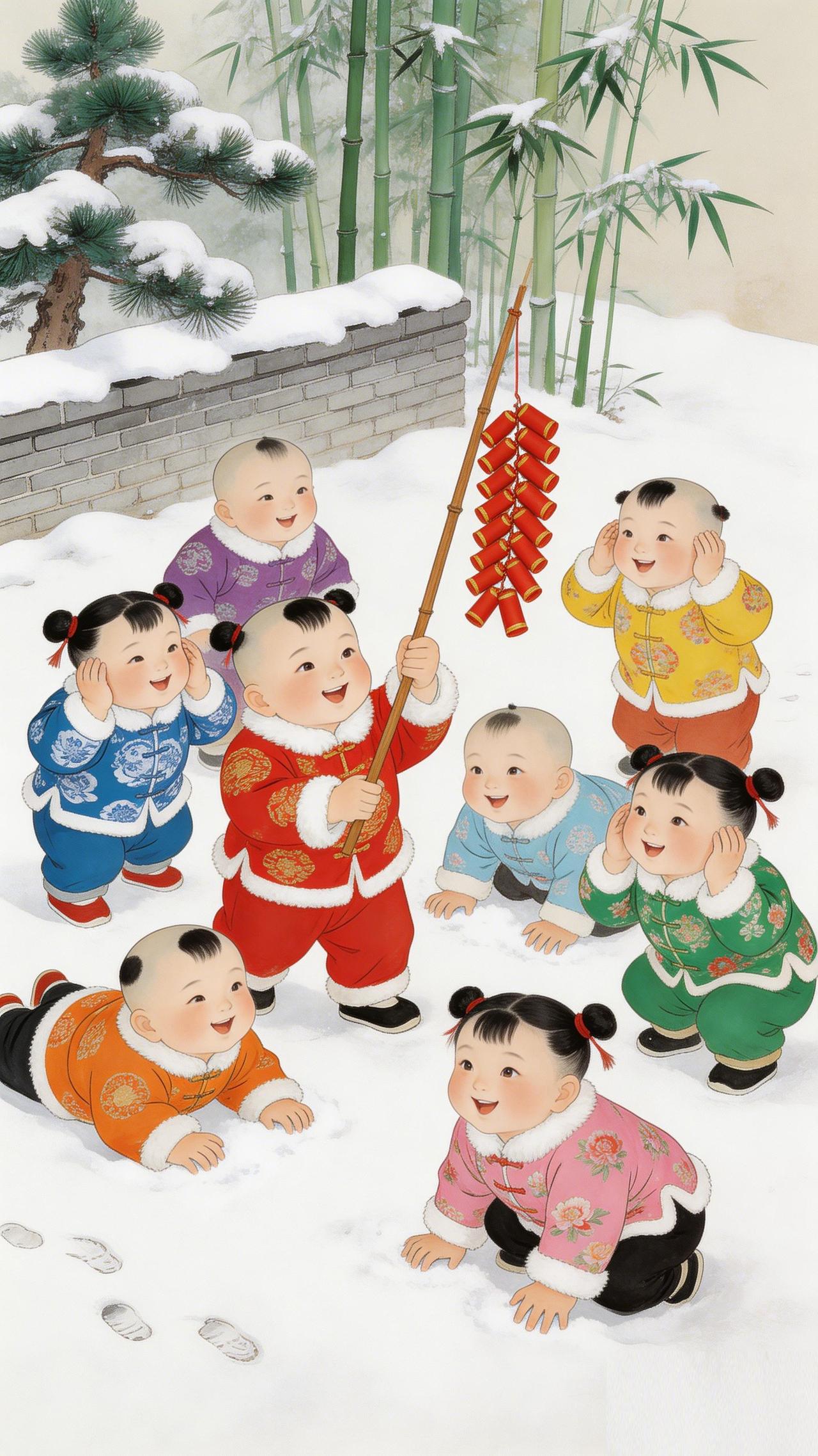 瑞雪映祥娃,这抹年画红是刻在骨子里的年味 雪覆松竹,红袄映白,这一院闹腾腾的欢喜,是传统年画里最动人的吉祥意。 你看那青砖墙下,八宝娃娃身着彩衣,在瑞雪地里嬉戏。红衣稚子高擎爆竹,燃动新岁的红火;群娃捂耳憨笑,将马年的期许藏进烂漫童颜。 传统年画的魔力,正在于这份跨越时光的喜庆。它以工笔绘团圆,用浓墨祝安康,把 “多福多寿”“岁岁平安” 的美好祈愿,都融进这鲜活的色彩里。 不必刻意追寻,这满屏的吉祥与热闹,就是中国人最踏实的年味。愿这画中瑞气,随春风入户,护佑你丙午马年,事事顺遂,岁岁长安。