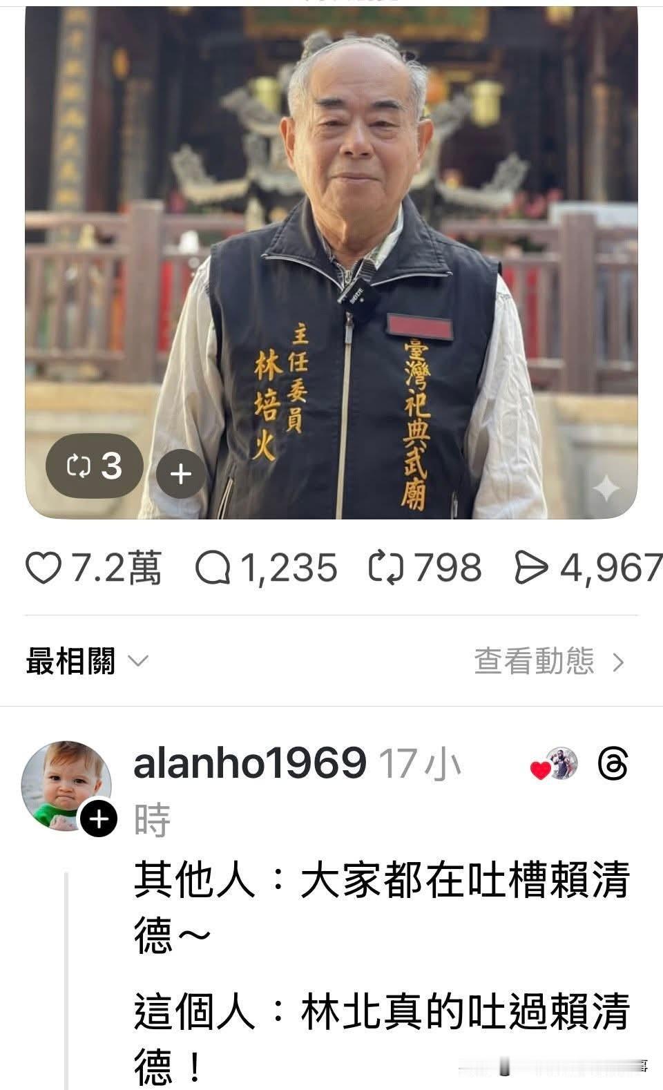 全台湾最有种的男人!这两天火遍台湾! 这两天岛内网络上蓝白等非绿阵营有位老头火了,很火很火的那种!他就是过年期间吐了赖清德一身的台湾省台南市宫庙主委林培火!当台湾民众还在口头上吐槽赖清德的时候,这个老头已经亲自吐了赖清德一身!让赖清德一身臭了。 他被台湾网友誉为最有魄力的男人,做了2300万人不敢做的事情!