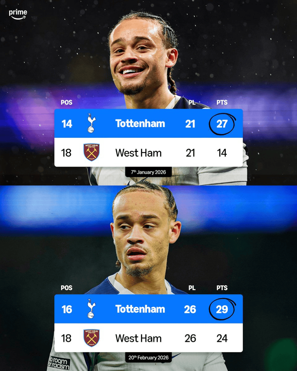 虎扑02月20日讯根据AmazonPrimeSport的报道,在短短五场比赛过后,托特纳姆热刺与英超降级区的分差从13分跌至只有5分。