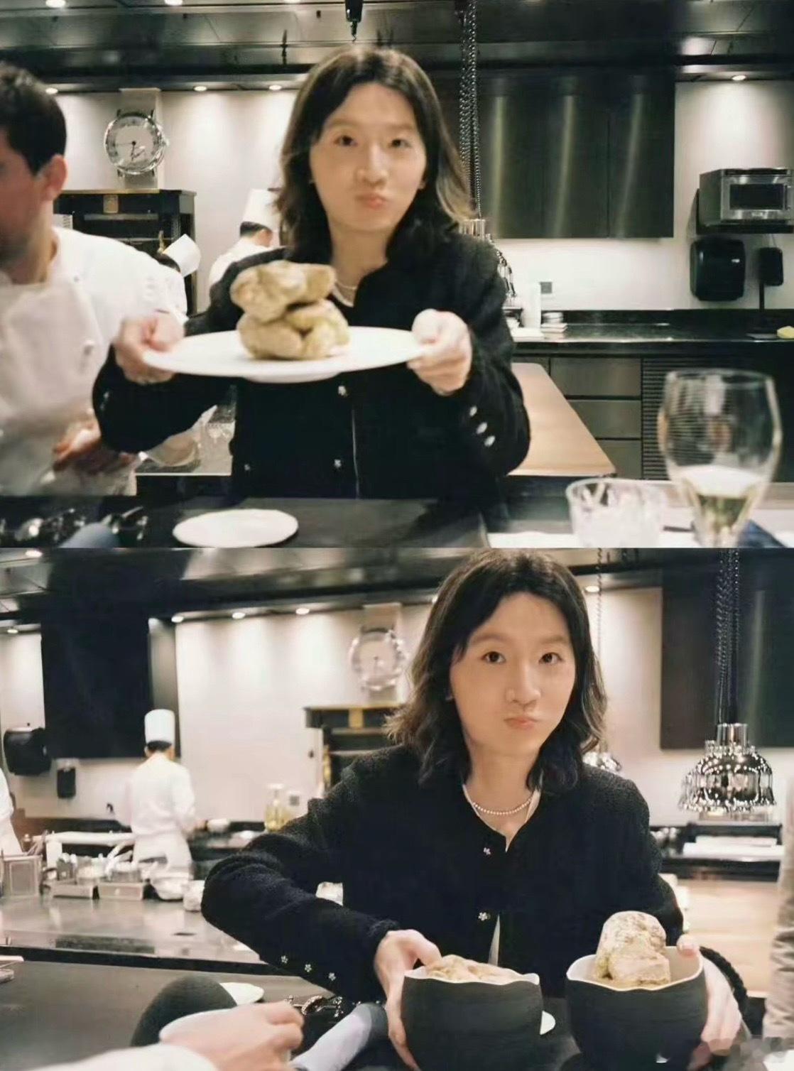 长卷发,裸色美甲+珍珠项链+小香风女装,妆容精致,面对镜头很自然地嘟嘴卖萌