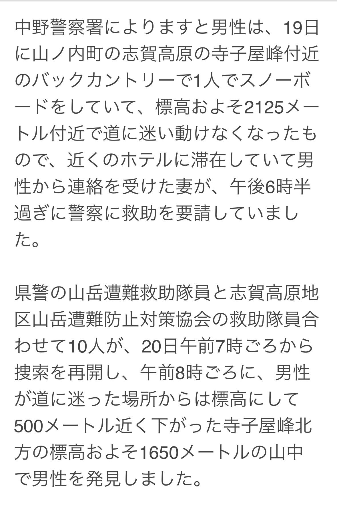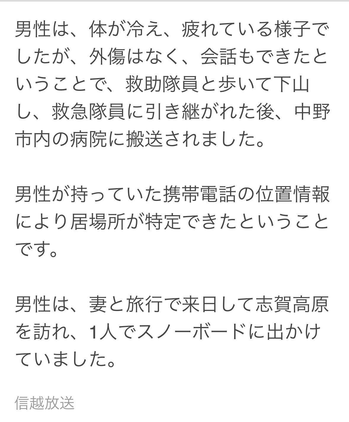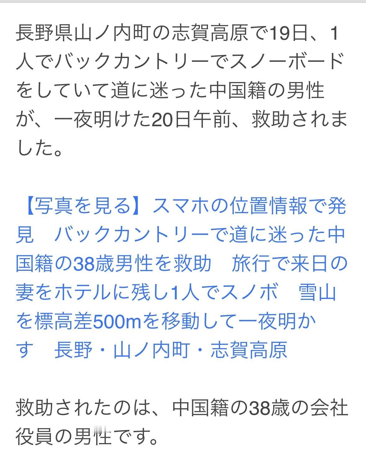 38岁中国男子在长野滑野雪迷路,今晨上午8点获救! 男子和老婆到志贺高原旅游,19日男子独咱一人去滑雪,老婆在饭店等他,下午6点半他老婆向警方求助。 县警和当地救援队共计10人出动,用智能手机定位找到了他。 男子冻得够呛,看上去很疲惫,没有外伤能说话。救援人员陪同他下山后医护人员将他送往医院。