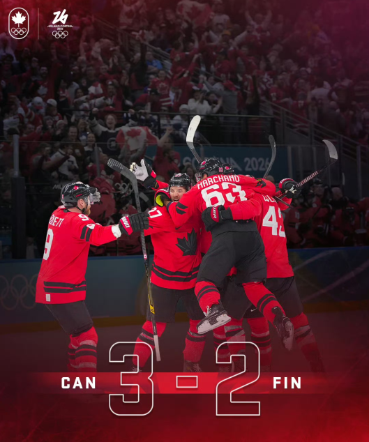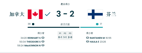 虎扑02月21日讯米兰冬奥会男子冰球第一场半决赛,加拿大队让二直追三,3-2险胜芬兰队,率先晋级决赛。