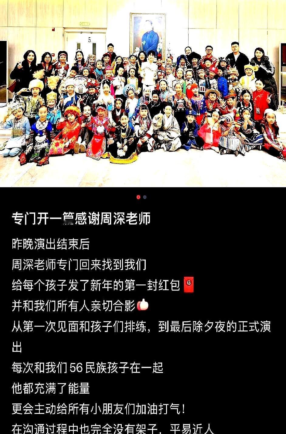 央视后台灯都快灭了,周深突然折返,弯腰往56个孩子手里挨个塞红包。 他从兜里掏出一沓厚厚的“利是”,跟每个孩子视线齐平,一个一个亲手递过去。孩子们攥着红包眼睛都亮了,有人喊“长大了还要跟你同台”。 带队老师都懵了,本来以为演出结束就各回各家,这种大场面,谁会真的把一群素不相识的伴舞孩子放在心上?人家压根没把他们当背景板。 一个人的人品到底怎么样,是不是就看他怎么对待那些“不重要”的人?