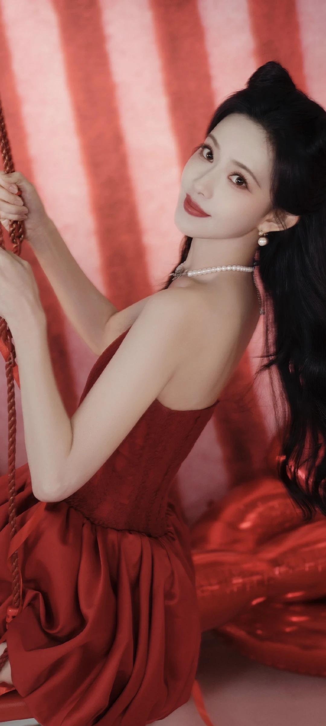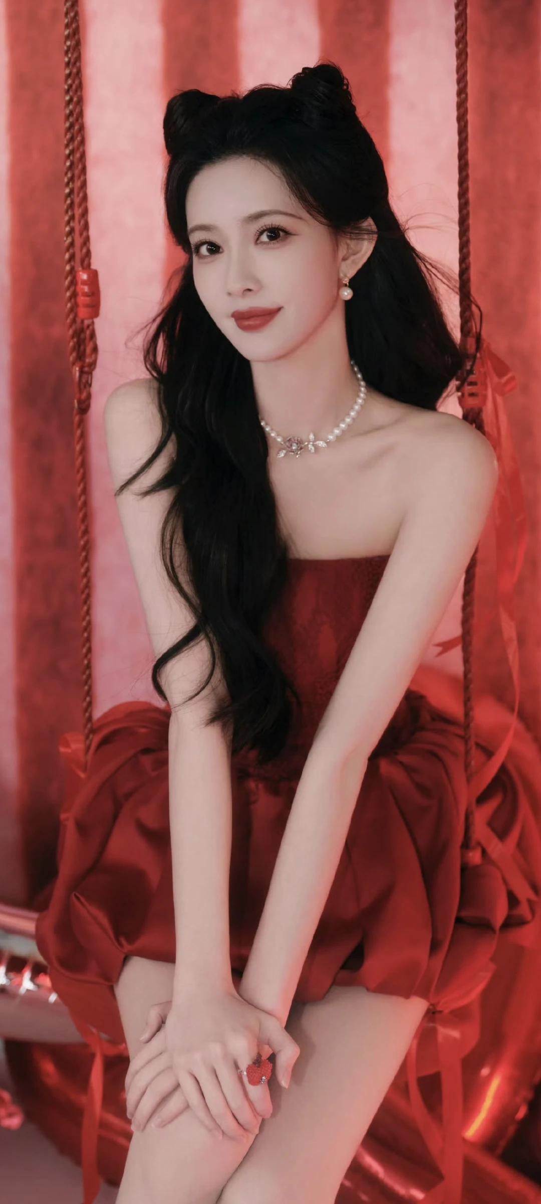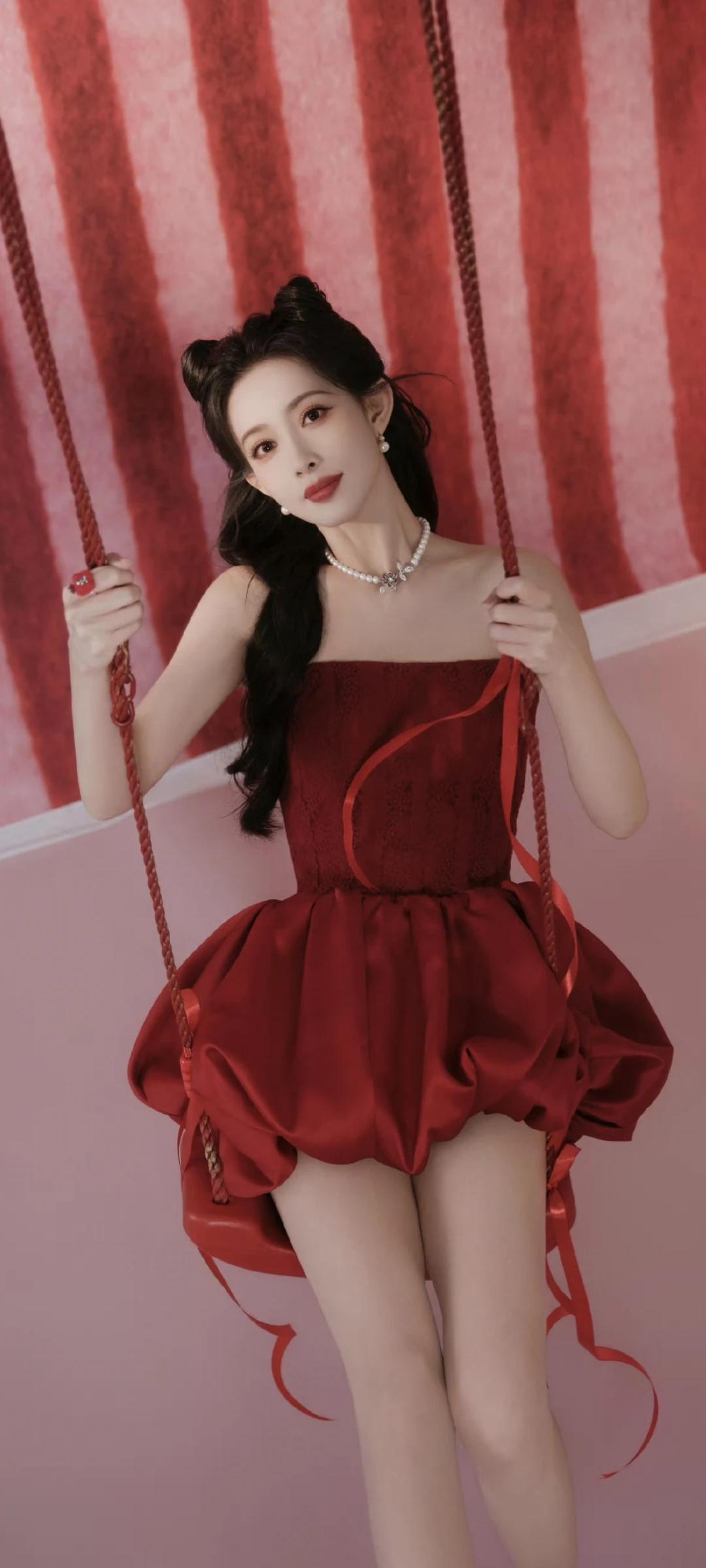孟子义写真壁纸~明艳红裙+精致猫耳造型,性感又甜美!