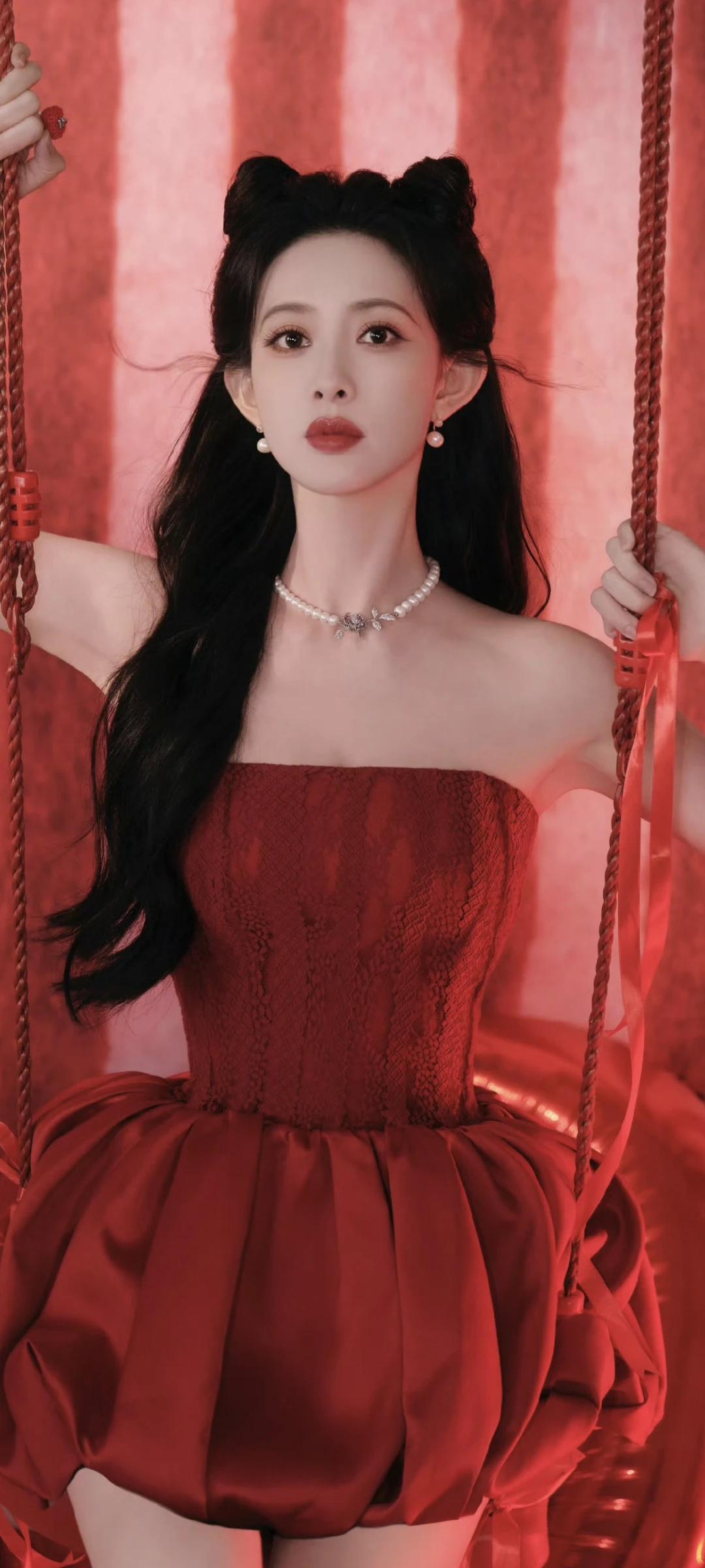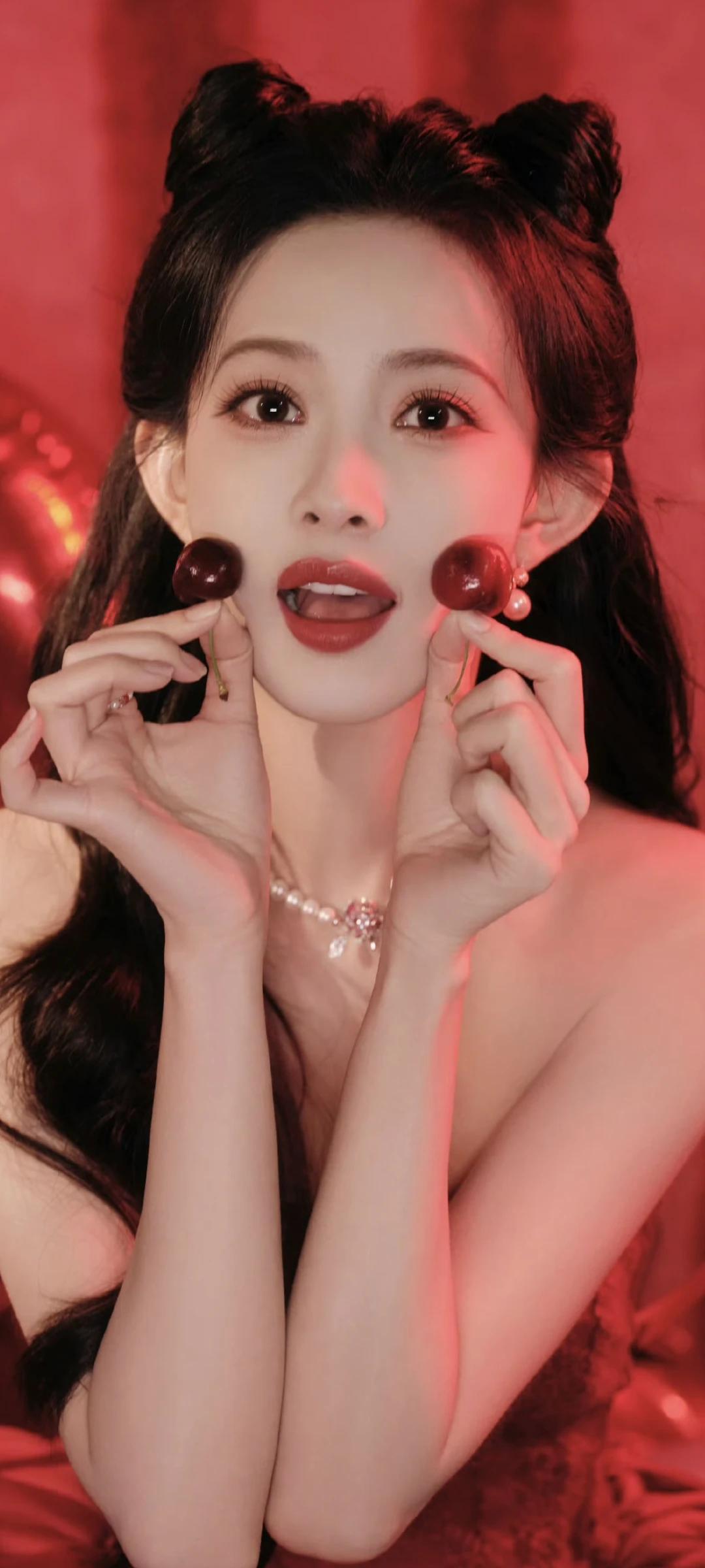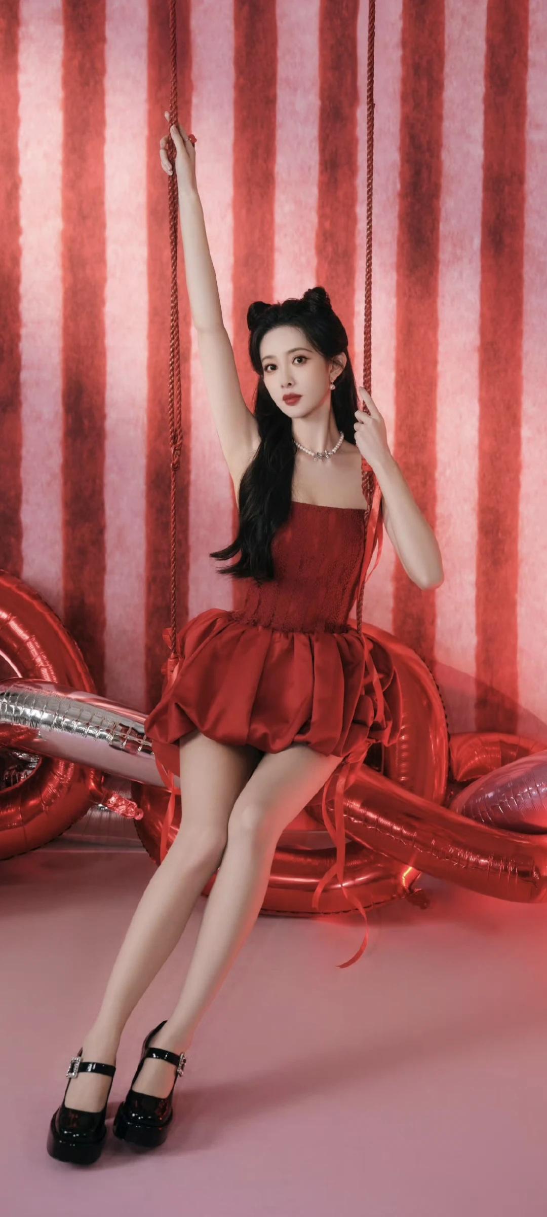 孟子义写真壁纸~明艳红裙+精致猫耳造型,性感又甜美!