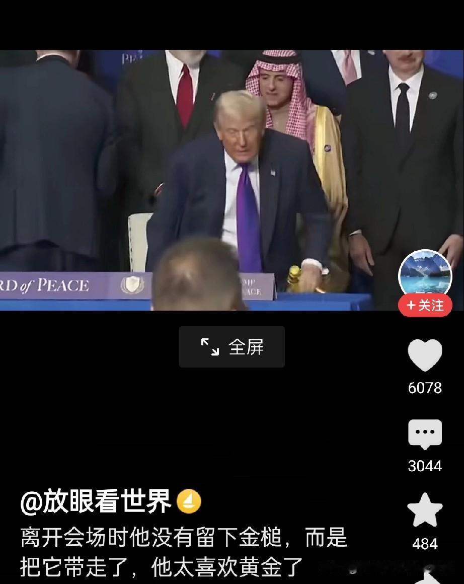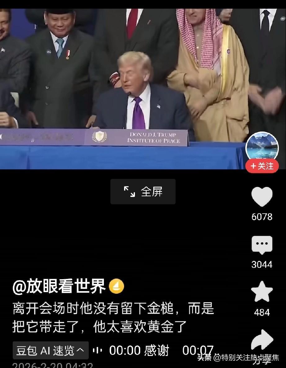 特朗普太喜欢黄金了拿走了金锤子 在2月19日的“和平委员会”首次会议上,特朗普敲响金锤宣告会议开始,这不仅是仪式,更是强权逻辑的具象化。 1. 金锤:敲响的是“美国优先”的强权 这把金锤并非传统的议事工具,而是特朗普“交易型外交”的缩影。它象征着: * 绝对权力:特朗普作为“终身主席”,拥有对决议的最终批准权,金锤代表着他“一锤定音”的独断。 * 资本门槛:委员会规定“10亿美元买永久席位”,金锤敲响的其实是资本入场券,将国际和平异化为金钱交易。 2. 会议现场:一边谈和平,一边下通牒 这场会议充满了戏剧性的矛盾: * 和平之名:会议讨论了加沙重建,试图塑造“和平缔造者”形象。 * 战争之实:就在同一天,特朗普在“空军一号”上对伊朗发出“10-15天”的最后通牒,威胁“要么达成协议,要么发生糟糕的事”。 3. 本质:披着多边外衣的单边霸权 “和平委员会”本质上是特朗普试图架空联合国、建立“美国版联合国”的工具。它用金锤和金钱包装,试图将国际规则私有化,服务于美国的单极霸权。