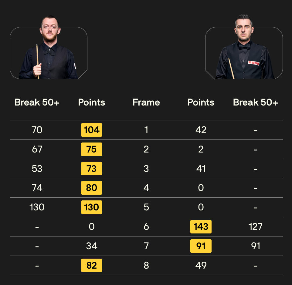 全场比赛,艾伦打出一杆破百(130)和四杆50+(70、67、53、74),塞尔比则打出一杆破百(127)和一杆50+(91)。
