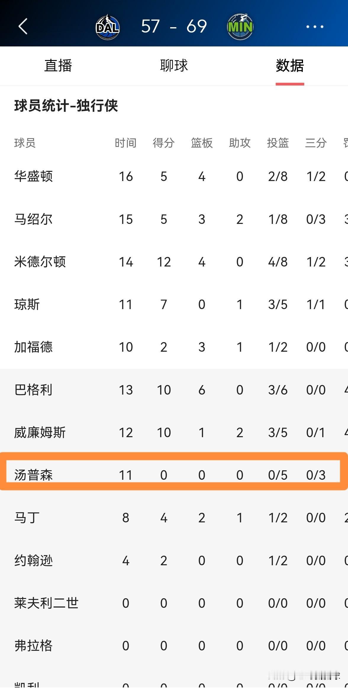 我真被独行侠球星汤普森给气疯了!在今天独行侠客场挑战森林狼的比赛中,目前双方半场战罢,独行侠以57:69落后于对手。让人感到特别气愤的是,在前两节比赛中,手感冰凉的汤普森竟然怒砍0分。 在上半场比赛中,汤普森替补出战11分钟,投篮5中0,其中三分球3中0怒砍0分0篮板0助攻0抢断,他的场上正负值为全队最低的-17。 老实说,当我看到汤普森在前两节比赛中的低迷表现后,我完全被气疯了。