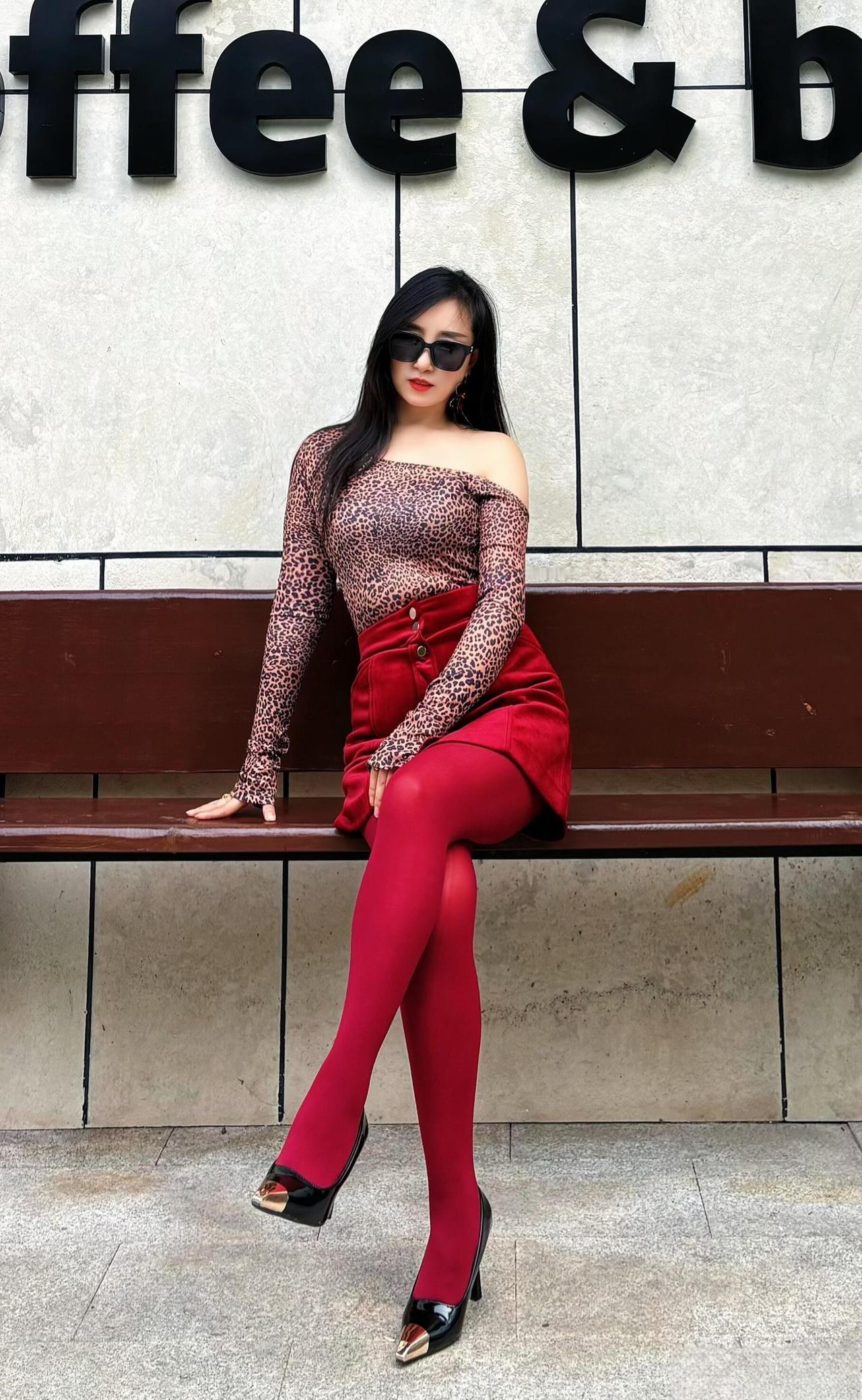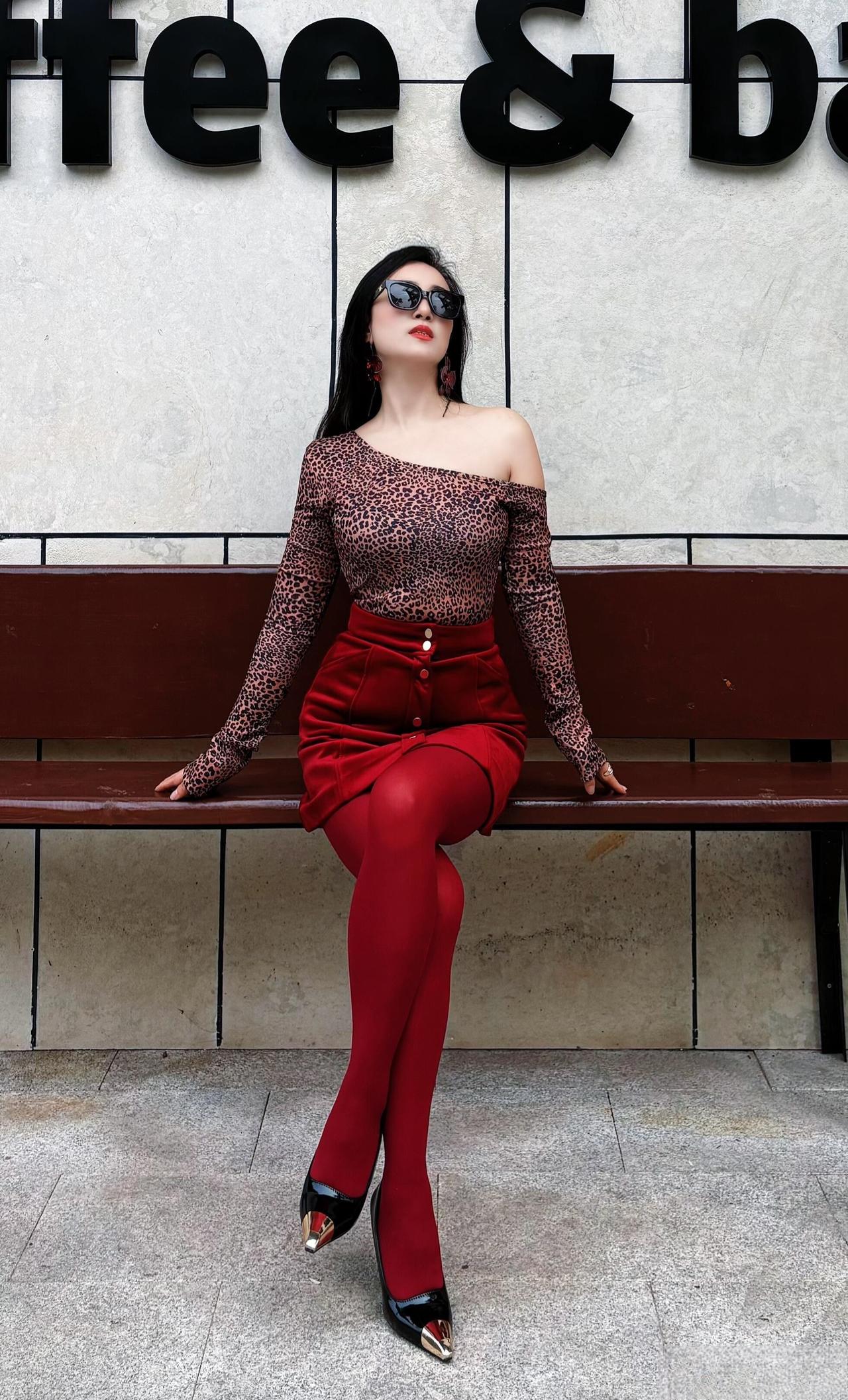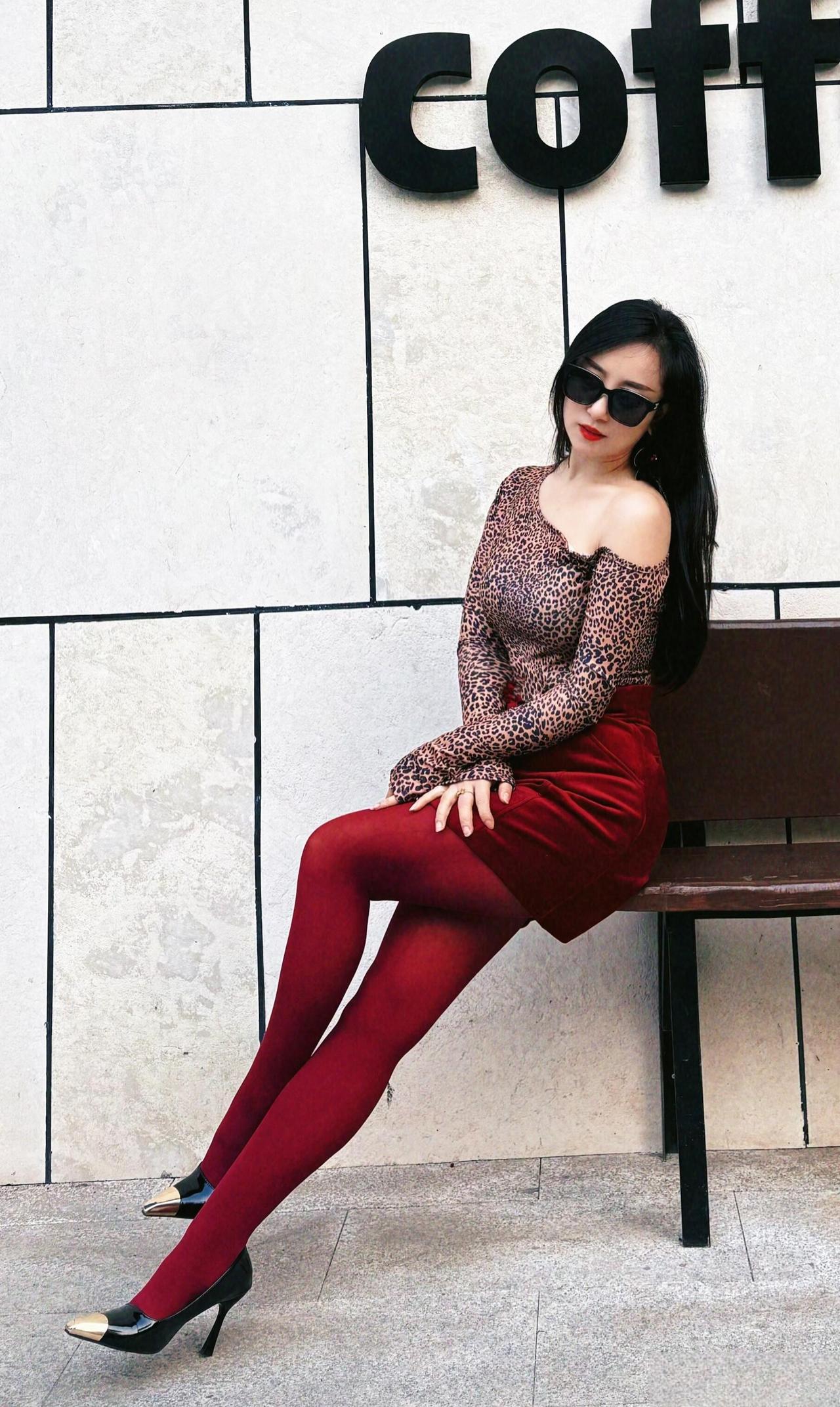 这套穿搭太有“复古辣妹感”了!豹纹一字肩上衣自带野性氛围,酒红短裙+同色袜子把明