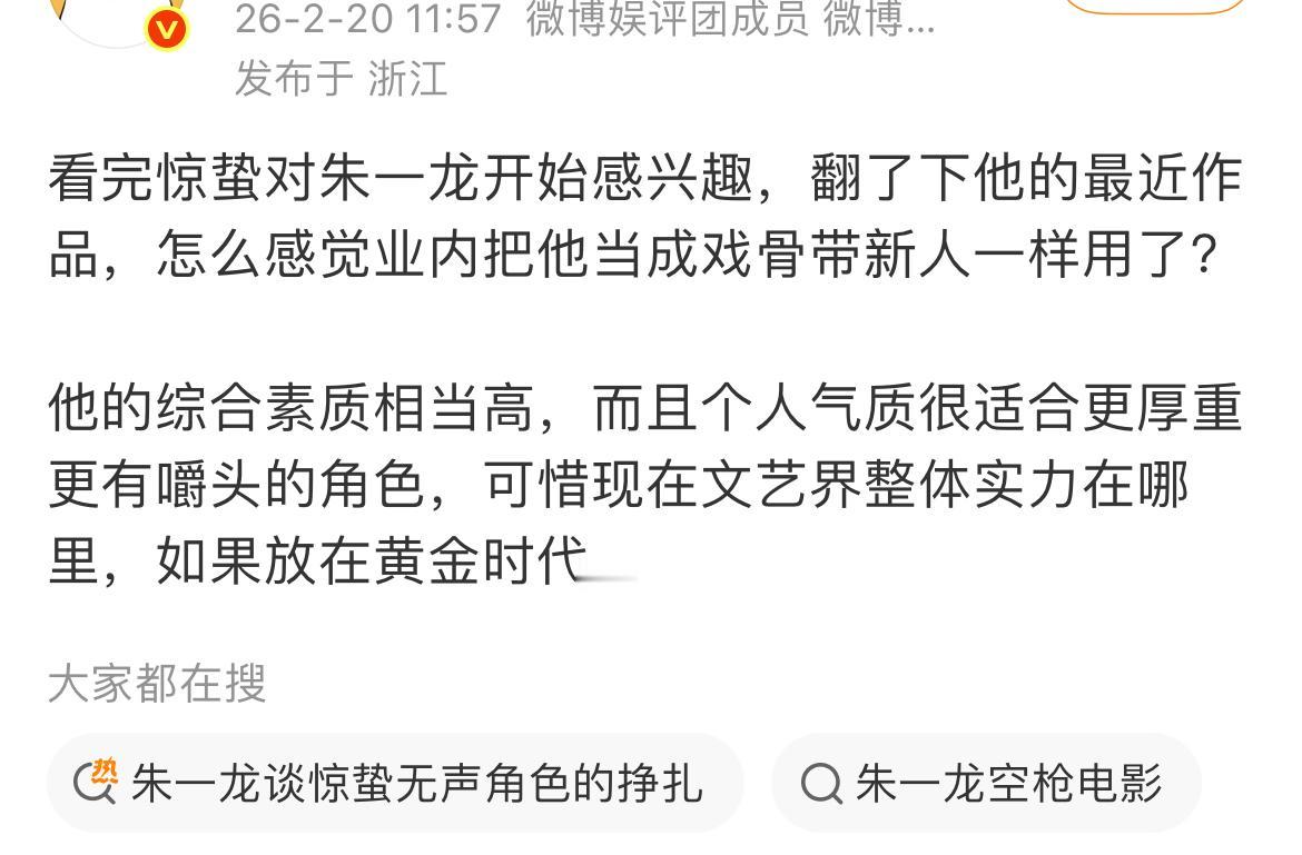 如今的电影市场,朱一龙真的可惜了,明明还是男演员黄金年龄,结果被用成老戏骨来“老带新”了。 朱一龙其实是大器晚成,三十岁才靠《镇魂》火,付出很多努力才开始演电影,但没有崛起在电影黄金时代,那么好的表演能力和外形条件,以及对表演的一腔赤忱,却遇不到真正优秀的剧本和有共鸣的团队,蛮唏嘘的。 但是他从来不抱怨,也难怪张艺谋说他身上看到中国电影的希望,我想这也是活在当下的意义。